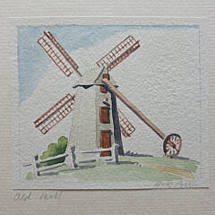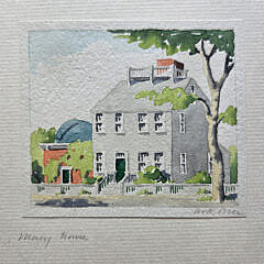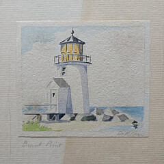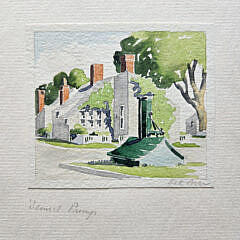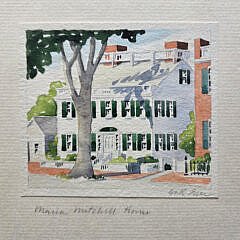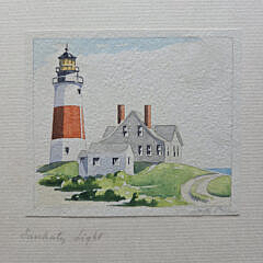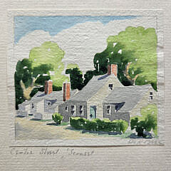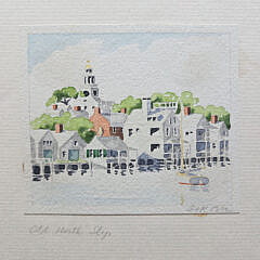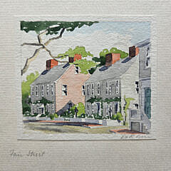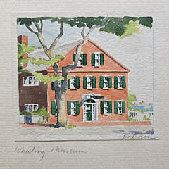 Based in the Wharf Head Studio on North Wharf after moving to town from ‘Sconset in 1940, Doris and her husband, Richard produced a well-known series of watercolor miniatures featuring popular Nantucket scenes. The couple frequently worked together on these copyrighted creations, Richard providing the line sketch and Doris completing the watercolor. Wharf Head Studio consisted of living quarters and an exhibition space, out of which the couple operated for an eighteen-year span. Doris’ work was praised by a reviewer as ‘calm, limpid, but crisply executed with an economy of line.’