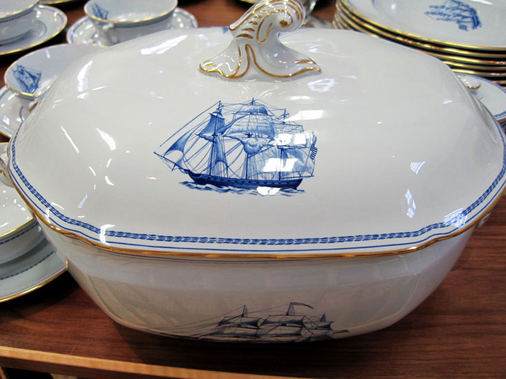 Copeland Spode Blue Tradewinds Dinner Service for 14: 14 dinner plates, 14 salad plates, 13 bread and butter plates, 12 creme soups & underplates, 12 bowls, 15 cups & 14 saucers, 4 serving platters, covered tureen & underplate, salad bowl, 3 vegetable bowls, covered vegetable bowl, 2 coffee pots, teapot, covered sugar & creamer, tankard, 2 gravy boats & underplates, 2 creamers, covered marmalade, 3 sets of salt & peppers, leaf dish, 2 ashtrays