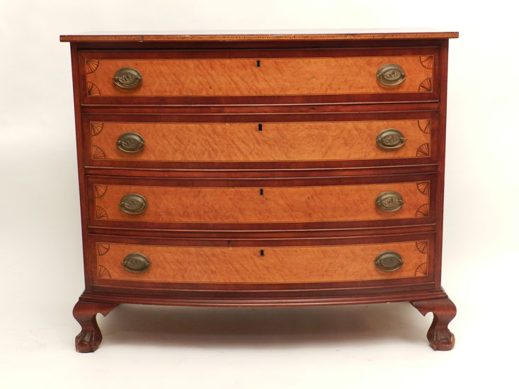 American Inlaid Bow Front Chest of Drawers Consign Now DeptFurniture/Decorative ArtsSizeHeight 35 in. Width 42 in. Depth 22 in. American Inlaid Bow Front Chest of Drawers, bird’s eye maple drawer fronts inlaid with quarter fans, candy stripe inlay on edge of top, later applied Chippendale style ball and claw feet. Height 35 in. Width 42 in. Depth 22 in. Please note that this auction has ended. Click here for an overview of this auction.