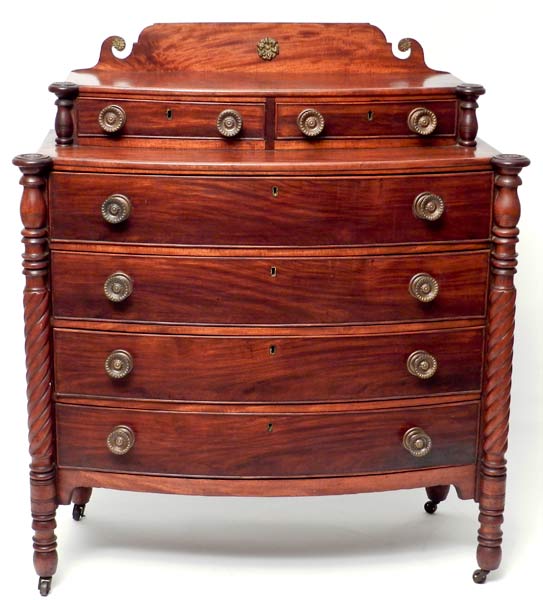19th Century American Sheraton Chest of Drawers Consign Now DeptFurniture/Decorative Arts 19th Century American Sheraton Chest of Drawers, circa 1830, back splash, two glove drawers of four long drawers, spiral turned columns Please note that this auction has ended. Click here for an overview of this auction.
