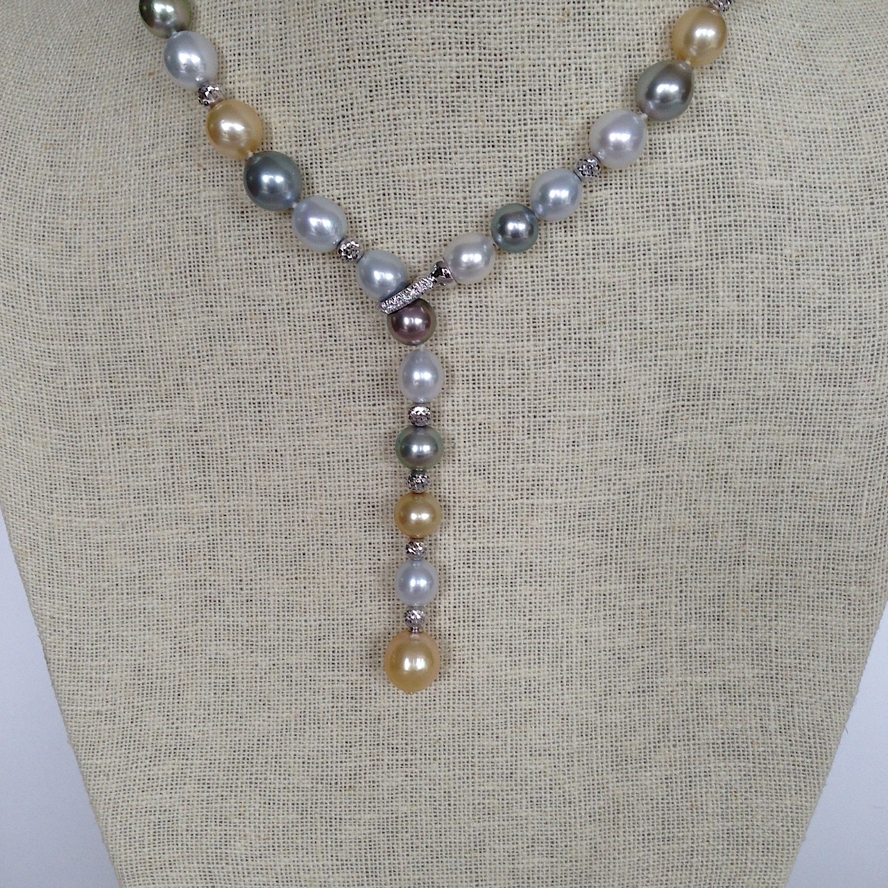 South Sea Pearls Lariat Necklace, 18k White Gold and Diamonds Clasp Consign Now DeptJewelrySizeLength 18 in. South Sea Peals Lariat Necklace, 18k White Gold and Diamonds Clasp, South Sea Pearls are natural shades of white, gold, grey and silver Length 18 in. 8.3mm x 11.1mm Please note that this auction has ended. Click here for an overview of this auction.
