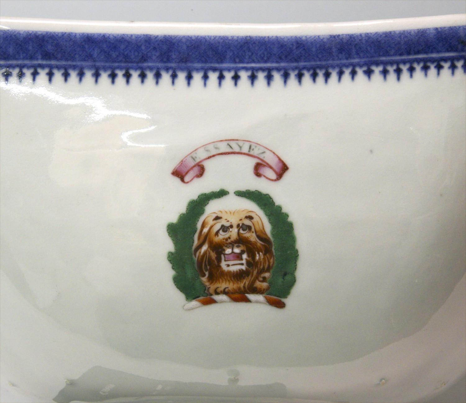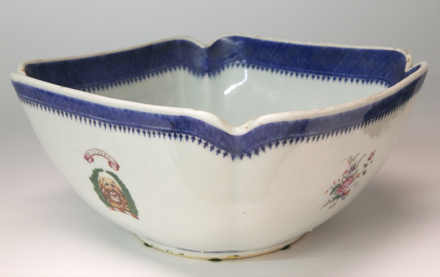 18th Century Chinese Export Porcelain Cut Corner Bowl, circa 1790, decorated with underglaze blue bands, polychrome crest of Dundee and famille rose sprays.