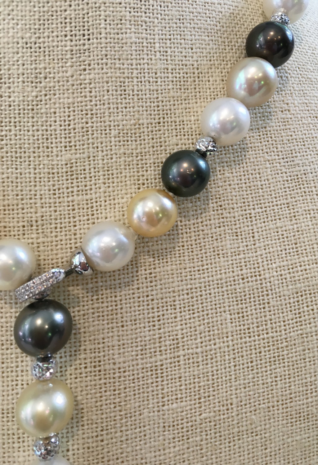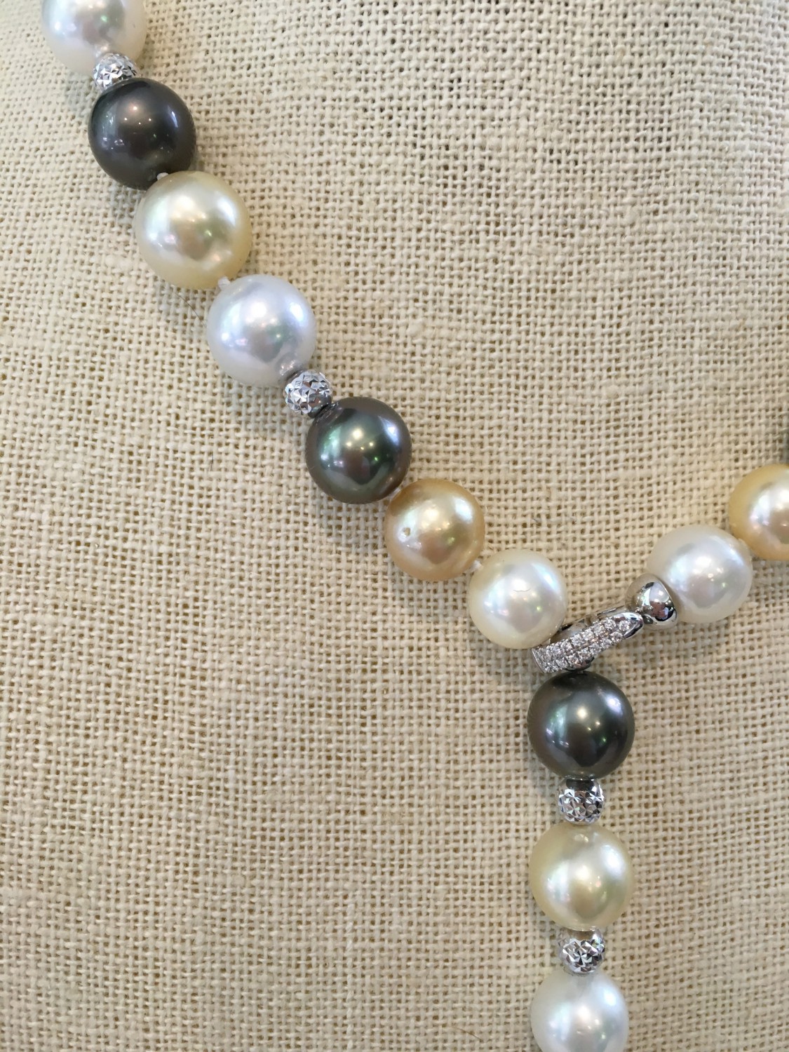Fine South Sea Pearl Natural Multi-Color Lariat Necklace Consign Now DeptJewelry Fine South Sea Pearl Natural Multi-Color Lariat Necklace, 9.2mm – 11.9mm pearls with 18k white gold spacers and .23ct diamond clasp. Please note that this auction has ended. Click here for an overview of this auction.
