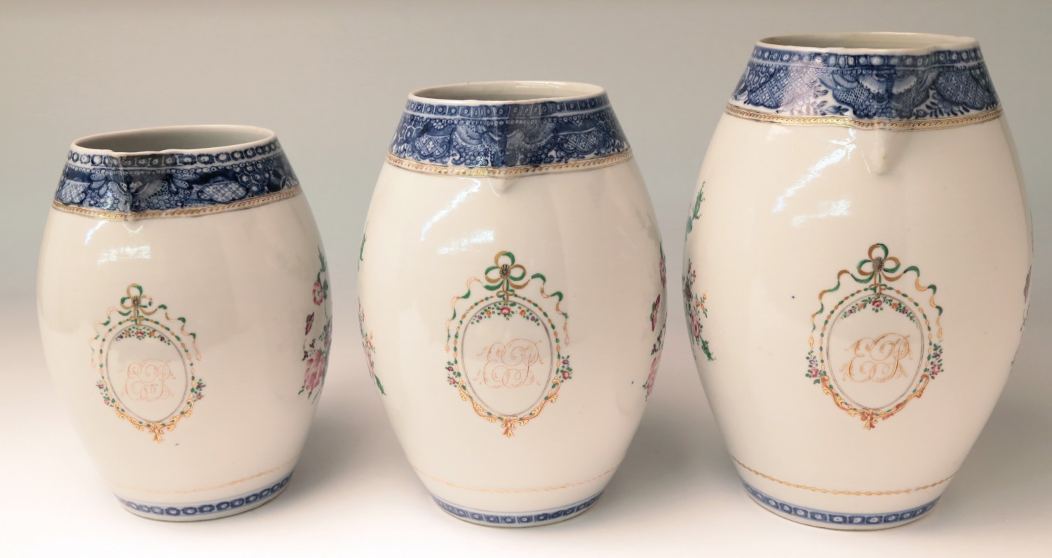 Set of Three 18th Century Chinese Export Graduated Famille Rose Jugs Consign Now DeptAsian Arts/China Trade, Ceramics & Glass Set of Three 18th Century Chinese Export Graduated Famille Rose Jugs, with initials “E.P.” and interlaced handles. Provenance: The Sandra P. Doubleday Collection; Removed from 28 Easton Street, Nantucket Please note that this auction has ended. Click here for an overview of this auction.