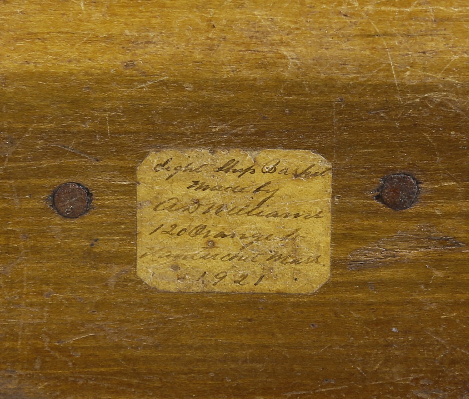 Arthur D. Williams (Nantucket 1867-1920?) Nantucket Basket, circa 1921, oval form with carved and shaped swing handle on cut brass ears with tapering staves from a poplar base. Hand written paper label on base “Light Ship Basket Made by A. D. Williams, 120 Orange St. Nantucket Mass. 1921”