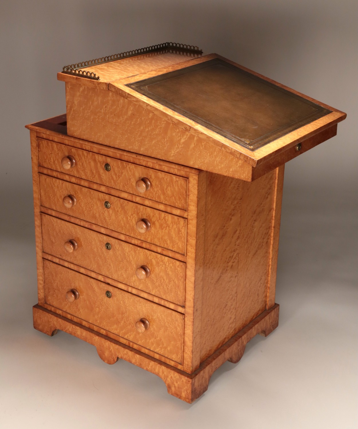 Fine English Bird’s Eye Maple Davenport Desk, circa 1850, exquisitely matched maple veneer throughout. Hinged leather slanted writing surface with brass gallery and mechanical sliding boxed top, over four graduating drawers on a shaped skirt.