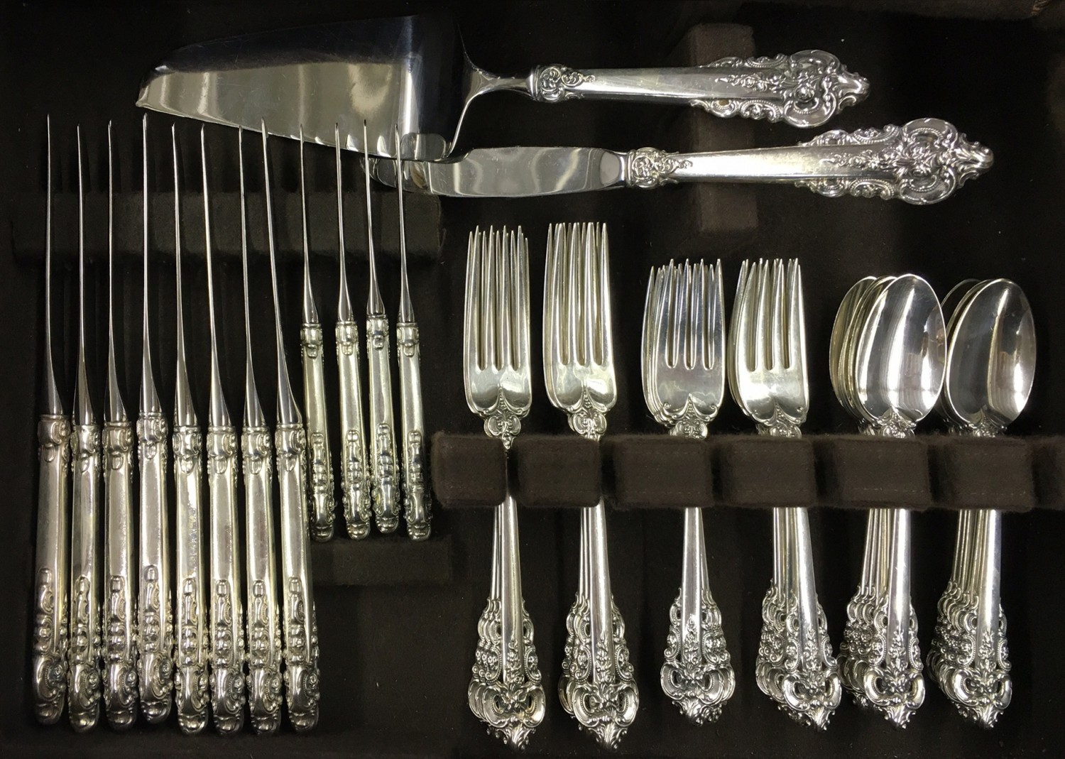 Wallace Sterling Silver Flatware Service for Eight in the “Grande Baroque” Pattern Consign Now DeptSilver Wallace Sterling Silver Flatware Service for Eight in the “Grande Baroque” Pattern Comprising: 9 Dinner Knives 8 Dinner Forks 10 Salad Forks 13 Teaspoons 4 Butter Knives Pie Server Please note that this auction has ended. Click here for an overview of this auction.