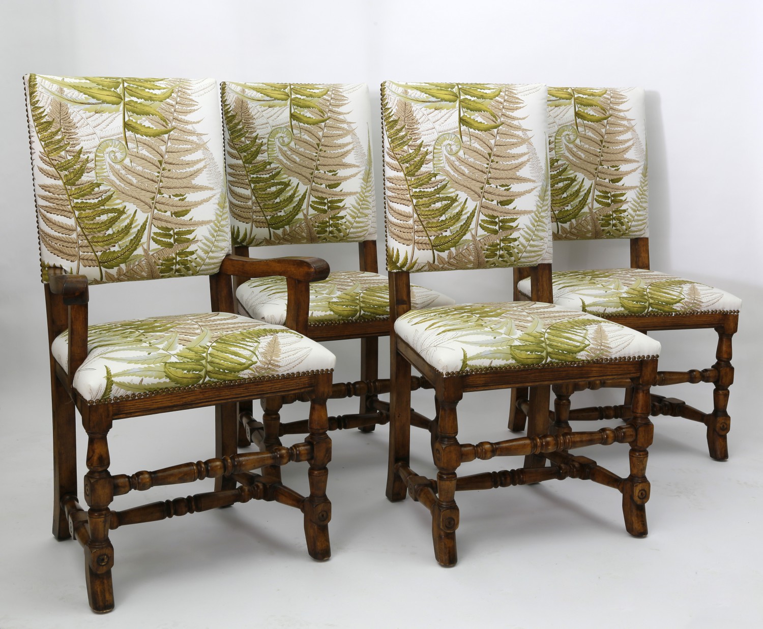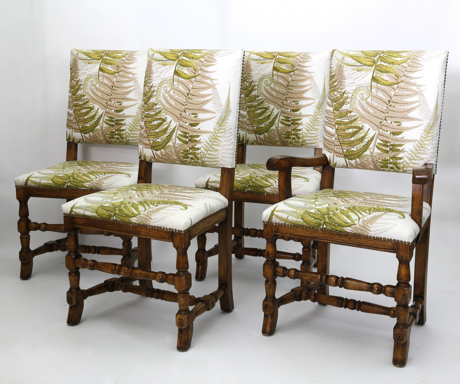 Set of Eight Upholstered Dining Chairs Consign Now DeptFurniture/Decorative Arts Set of Eight Dining Chairs, fern printed fabric upholstered seats and backs, block & turned legs and stretchers, comprising two armchairs and six side chairs. Please note that this auction has ended. Click here for an overview of this auction.