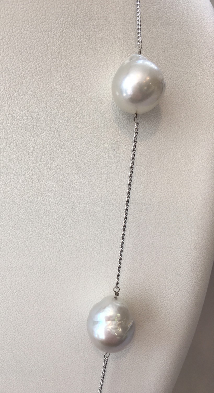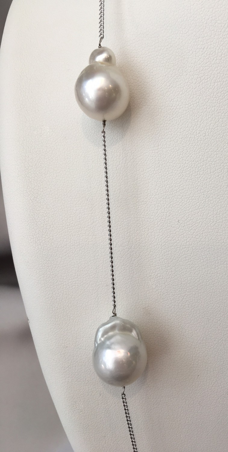 12mm – 14mm White South Sea Baroque Pearl Necklace Consign Now DeptJewelrySizeLength 26 in. 12mm – 14mm White South Sea Baroque Pearl Necklace, on sterling silver chain. Length 26 in. Please note that this auction has ended. Click here for an overview of this auction.