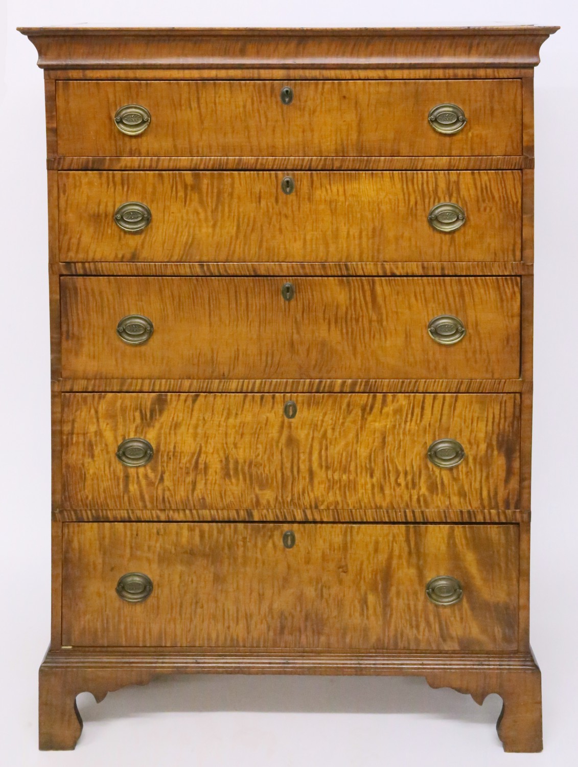 Bench Made Tiger Maple Chippendale Style Chest of Drawers Consign Now DeptFurniture/Decorative ArtsSizeHeight 52 in. Width 39 in. Depth 19 ½ in. Bench Made Tiger Maple Chippendale Style Chest, with five graduating drawers, on bracket feet. Height 52 in. Width 39 in. Depth 19 ½ in. Please note that this auction has ended. Click here for an overview of this auction.