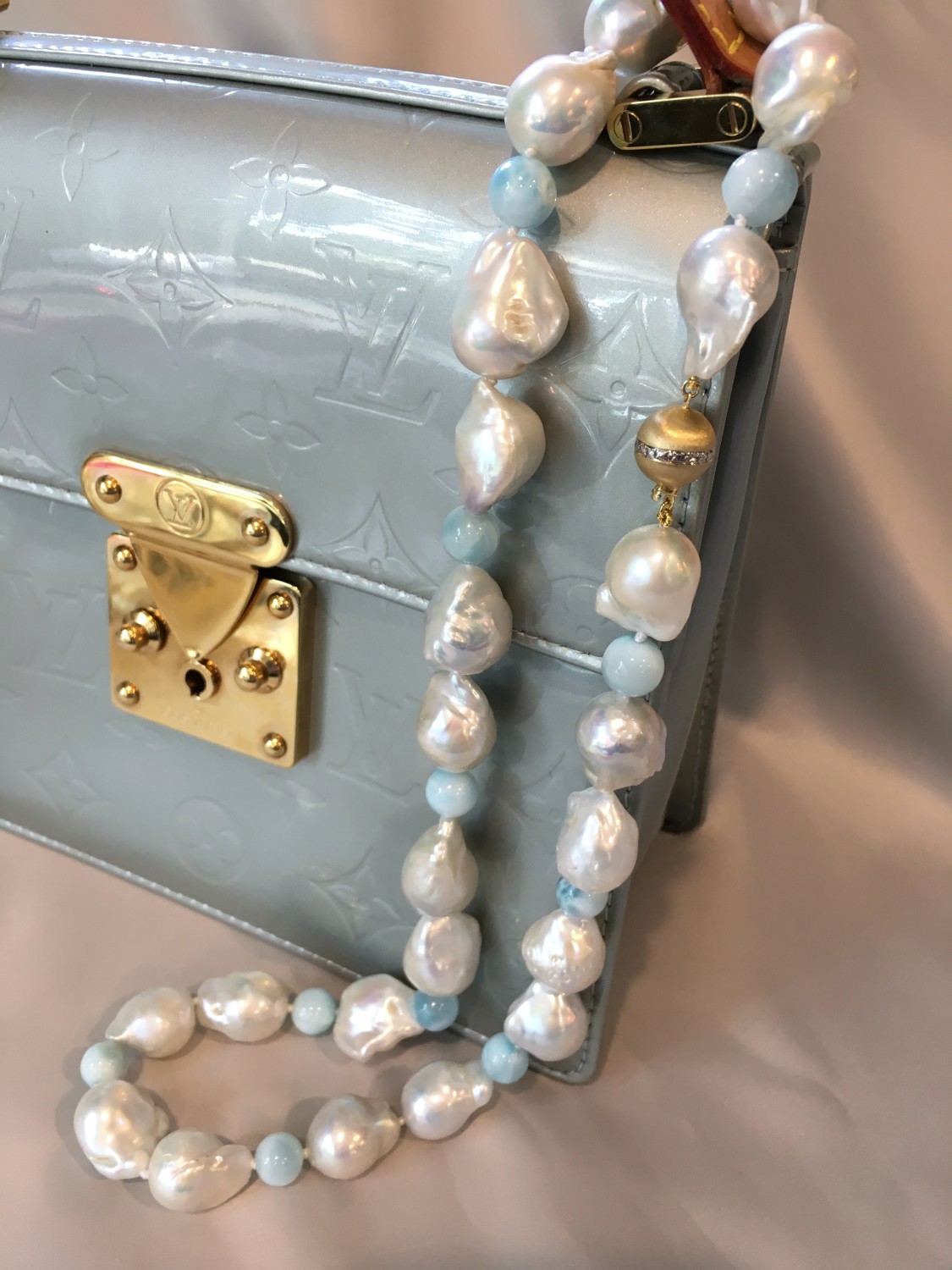 14mm – 17mm Cultured White Baroque Fresh Water Pearl & Larimar Bead Necklace Consign Now DeptJewelrySizeLength 22 in. 14mm – 17mm Cultured White Baroque Fresh Water Pearl & Larimar Bead Necklace, with 14k yellow gold and diamond clasp. Length 22 in. Please note that this auction has ended. Click here for an overview of this auction.