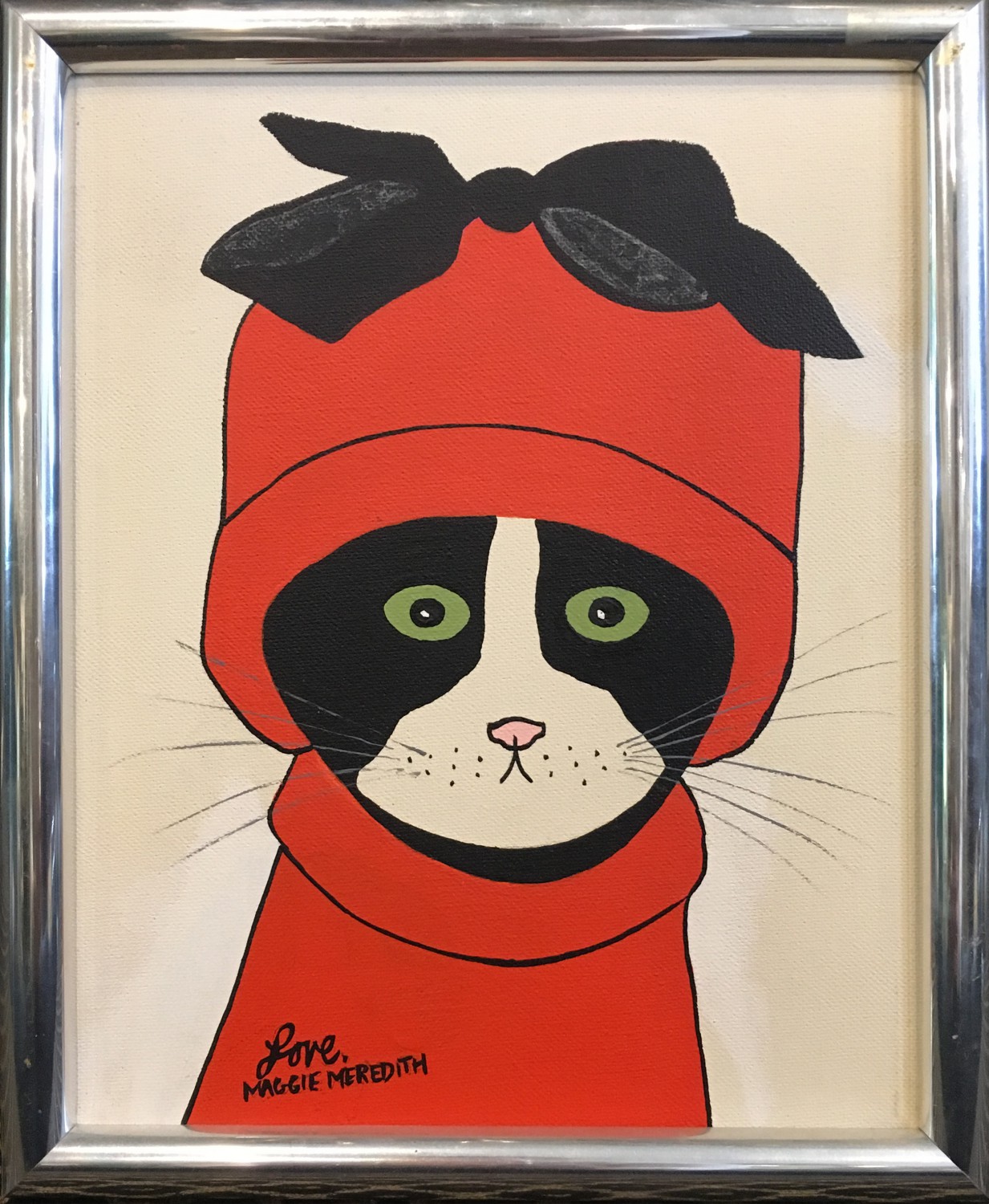 Maggie Meredith Oil on Canvas “A Cat in Red” Consign Now DeptNantucket ArtSize10 in. x 8 in. Maggie Meredith (1922-2012) Oil on Canvas “A Cat in Red,” depicting a black and white cat in red coat and hat with bow, signed lower left “Love, Maggie Meredith.” 10 in. x 8 in. Please note that this auction has ended. Click here for an overview of this auction.