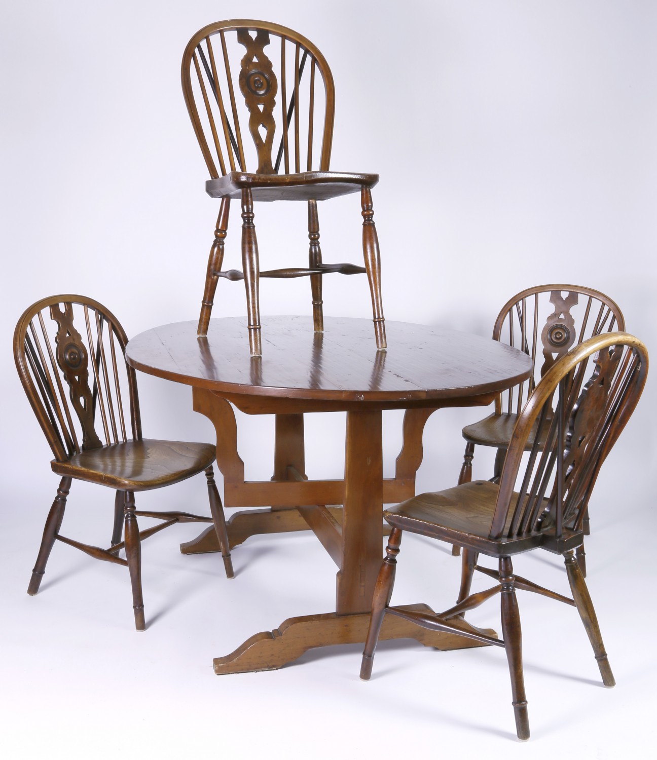 Set of Four 18th C. Dining Chairs & Wine Tasting Table Consign Now DeptFurniture/Decorative Arts Set of Four 18th Century English Elm Wheel and Brace Back Dining Chairs 19th Century Mahogany Wine Tasting Table, on a trestle base. Height 30 in. Width 59 in. Depth 43 in. Please note that this auction has ended. Click here for an overview of this auction.