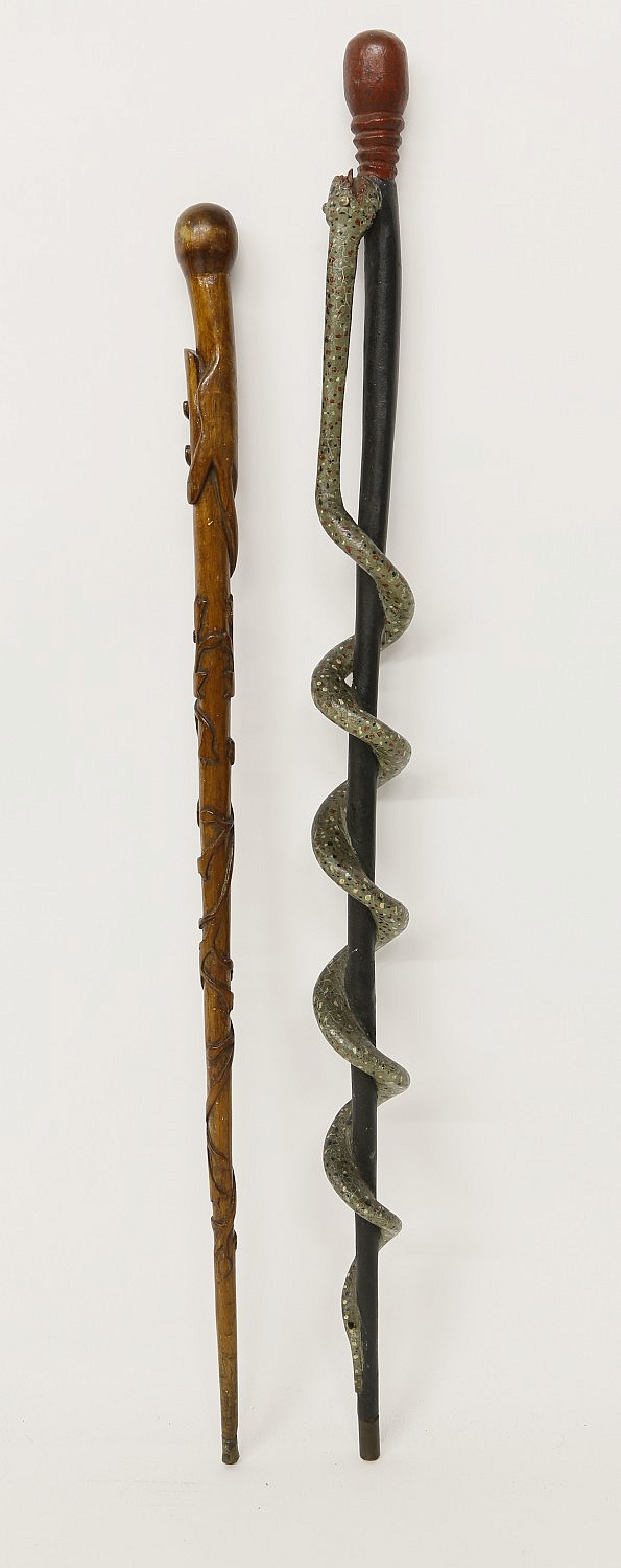 Folk Art Carved Ohio Hand Walking Stick and Folk Art Carved and Painted Snake Cane
