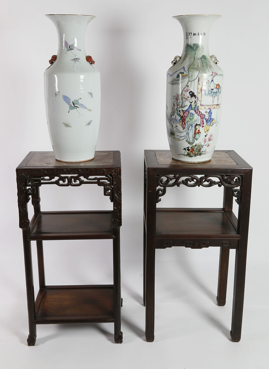 Two Famille Rose Chinese Porcelain Vases and Two Chinese Pedestal Tables Consign Now DeptAsian Arts/China Trade, Furniture/Decorative ArtsSizeHeight 31 in. Width 16 in. Depth 12 in. Two Famille Rose Chinese Porcelain Vases, polychrome decorated with figures in landscapes, foo dog head applications at neck Height 23 in. Two Chinese Marble Insert Teak Pedestal Tables with shelves Height 31 in. Width 16 in. Depth 12 in. Please note that this auction has ended. Click here for an overview of this auction.