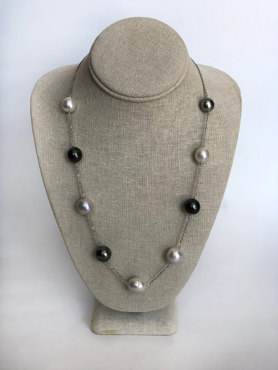 12mm-15mm Tahitian and White South Sea Pearl Necklace Consign Now DeptJewelrySizeLength 22 in. 12mm-15mm Tahitian and White South Sea Pearl Necklace, sterling silver chain Length 22 in. Please note that this auction has ended. Click here for an overview of this auction.