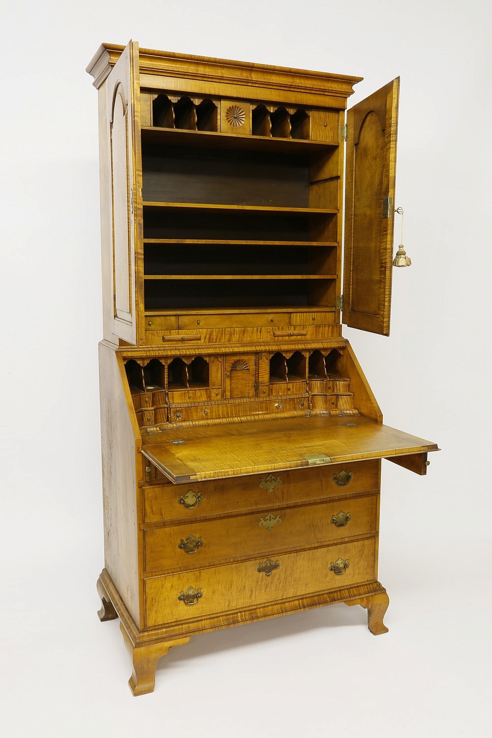 Eldred Wheeler Two Part Tiger Maple Secretary Bookcase, paneled arched doors with eight interior pigeon holes, shaped drawers and central fan carved door, lower section with four graduated drawers on bracket feet, the lid opens to reveal numerous pigeon holes, shaped drawers, carved shell door.