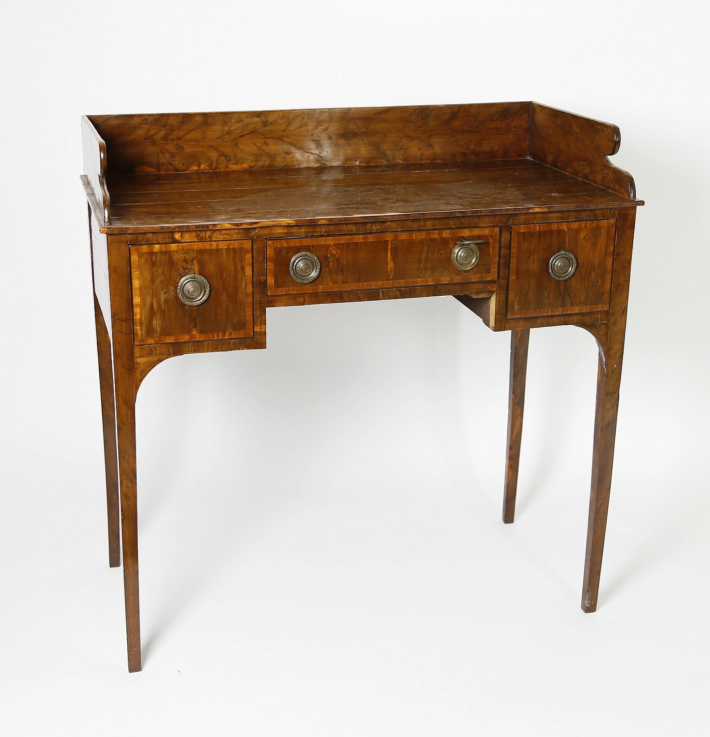 English Burlwood Writing Table, circa 1800, three drawer front with cross banding and brass ring pulls