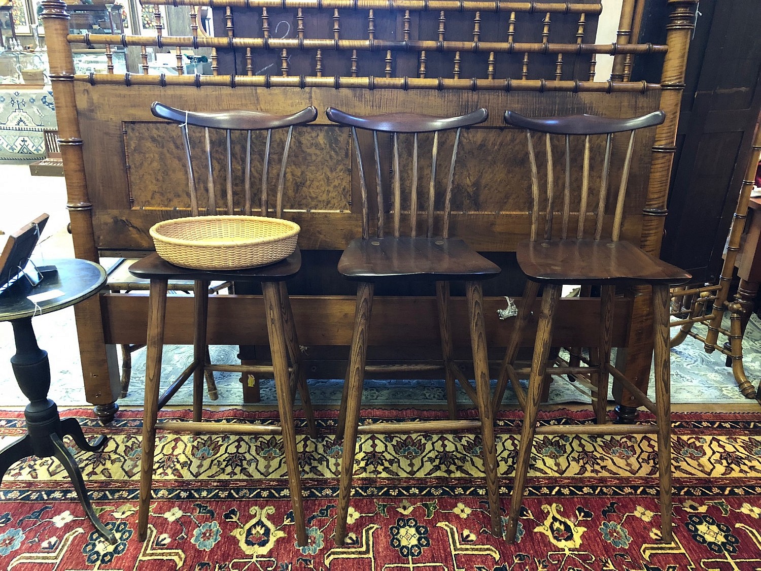 Set of Three Stephen Swift Comb-Back Bar Stools Crafted in Mahogany and Oak, signed and dated upon the base of seats 2005