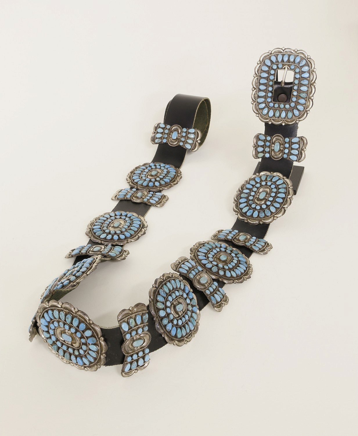 Signed Victor Moses Begay (Active 1950-1980) Sterling Silver and Turquoise Concho Belt, 7 conchos, 8 butterflies and signed buckle “VMB”; the belt buckle, conchos and butterflies each feature numerous hand-cut and polished, round and petite-point shaped blue turquoise stones and twisted silver wire details.