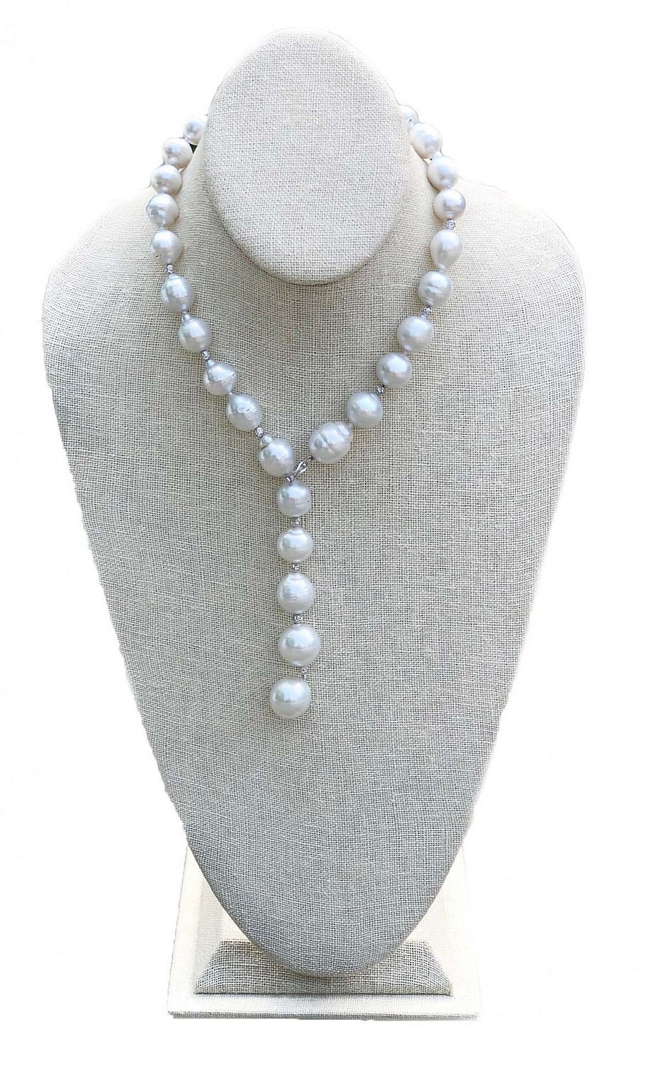 16mm-12.2mm White Baroque South Sea Pearl Lariat Necklace Consign Now DeptJewelry 16mm-12.2mm White Baroque South Sea Pearl Lariat Necklace, 14K white gold enhancers and clasp Please note that this auction has ended. Click here for an overview of this auction.