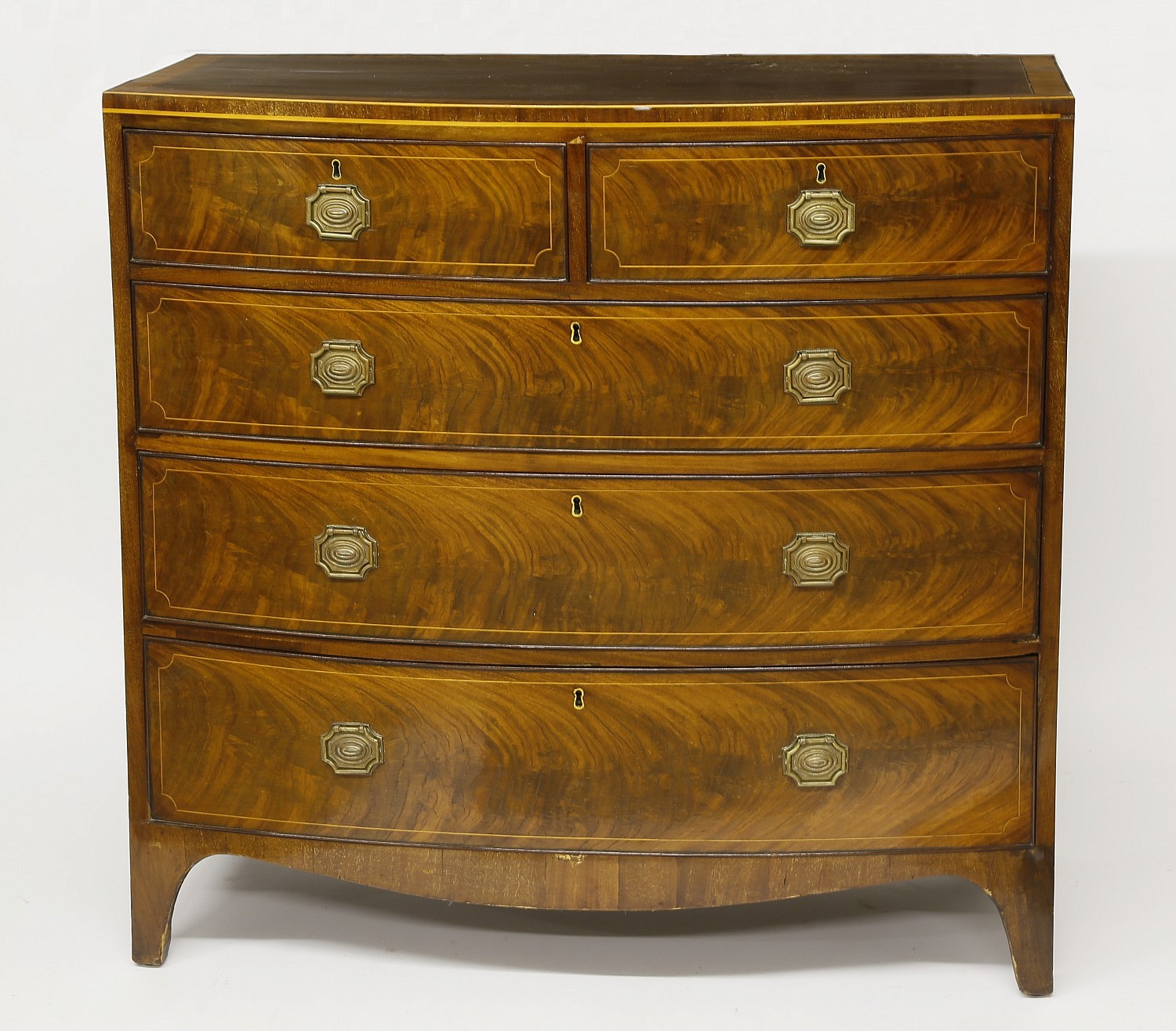 English Bow Front Mahogany Chest of Drawers Consign Now DeptFurniture/Decorative ArtsSizeHeight 40 in. Width 42 in. Depth 21 in. English Bow Front Mahogany Chest of Drawers, circa 1820, the top is cross banded in satinwood, drawers having line inlay, brass repousse pulls on bracket feet Height 40 in. Width 42 in. Depth 21 in. Please note that this auction has ended. Click here for an overview of this auction.