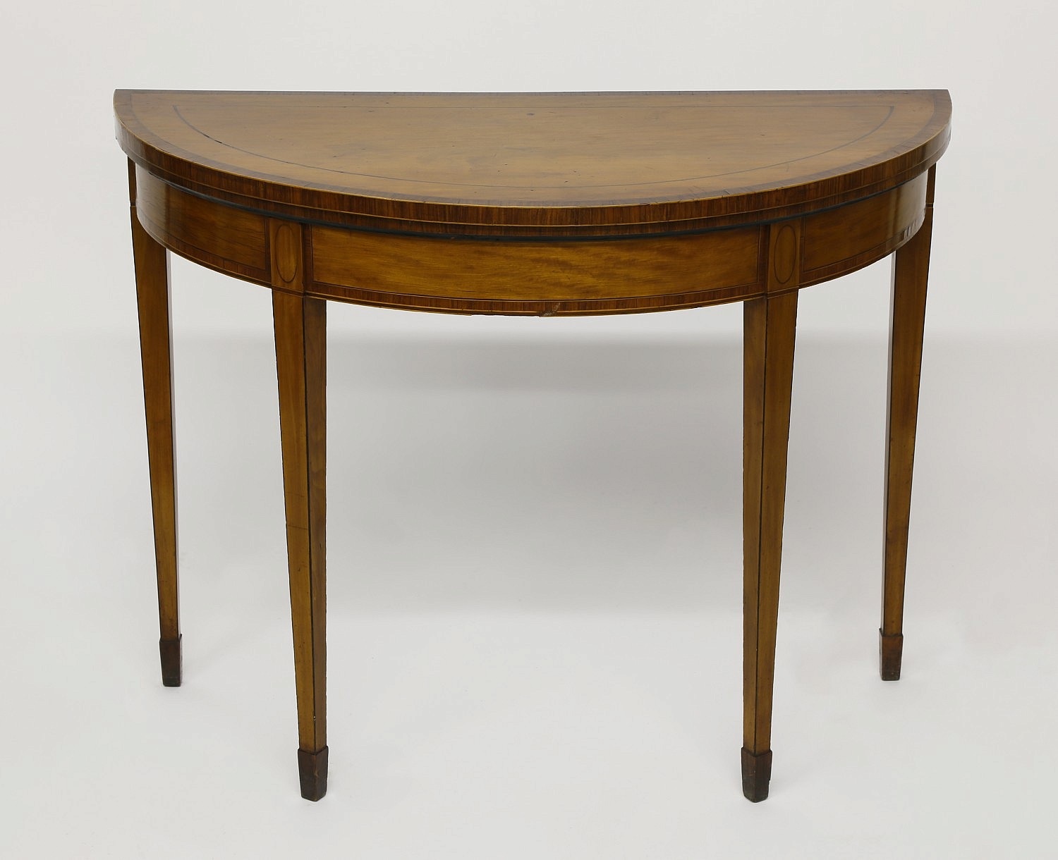 English Hepplewhite Style Demilune Game Table Consign Now DeptFurniture/Decorative ArtsSizeHeight 29 in. Width 37 in. Depth 17 in. English Hepplewhite Style Demilune Game Table, 19th century Height 29 in. Width 37 in. Depth 17 in. Please note that this auction has ended. Click here for an overview of this auction.