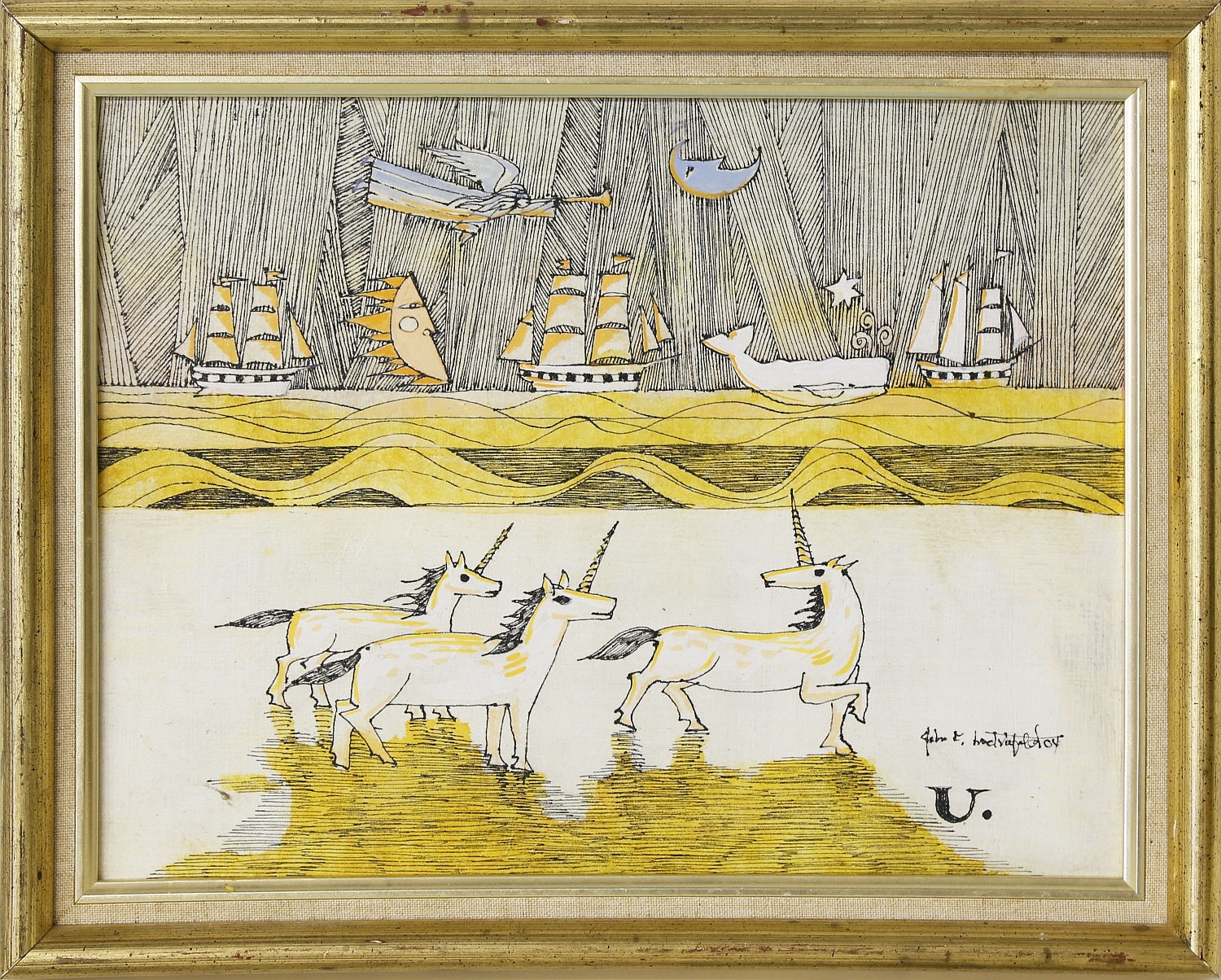 John F. Lochtefeld Acrylic and Pen on Masonite “Unicorns and Whales”, signed lower right John F. Lochtefeld, in gilt frame