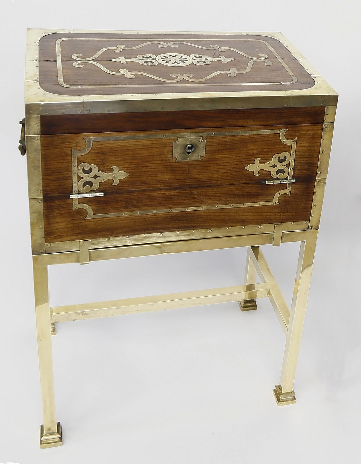 Anglo-Indian Brass-inlaid Exotic Hardwood Campaign Desk, mid-19th century, brass bound and inlaid writing desk of rectangular form with hinged top and front opening to form a writing surface and to disclose a compartmented interior on later brass stand.