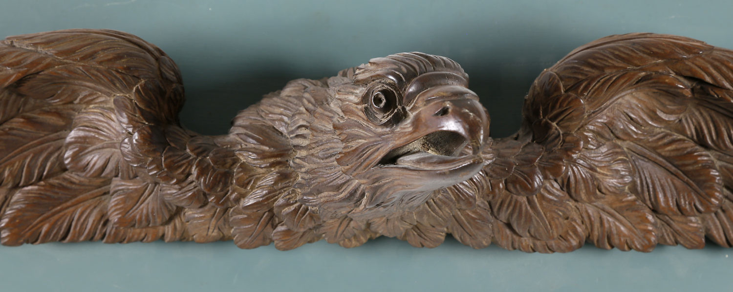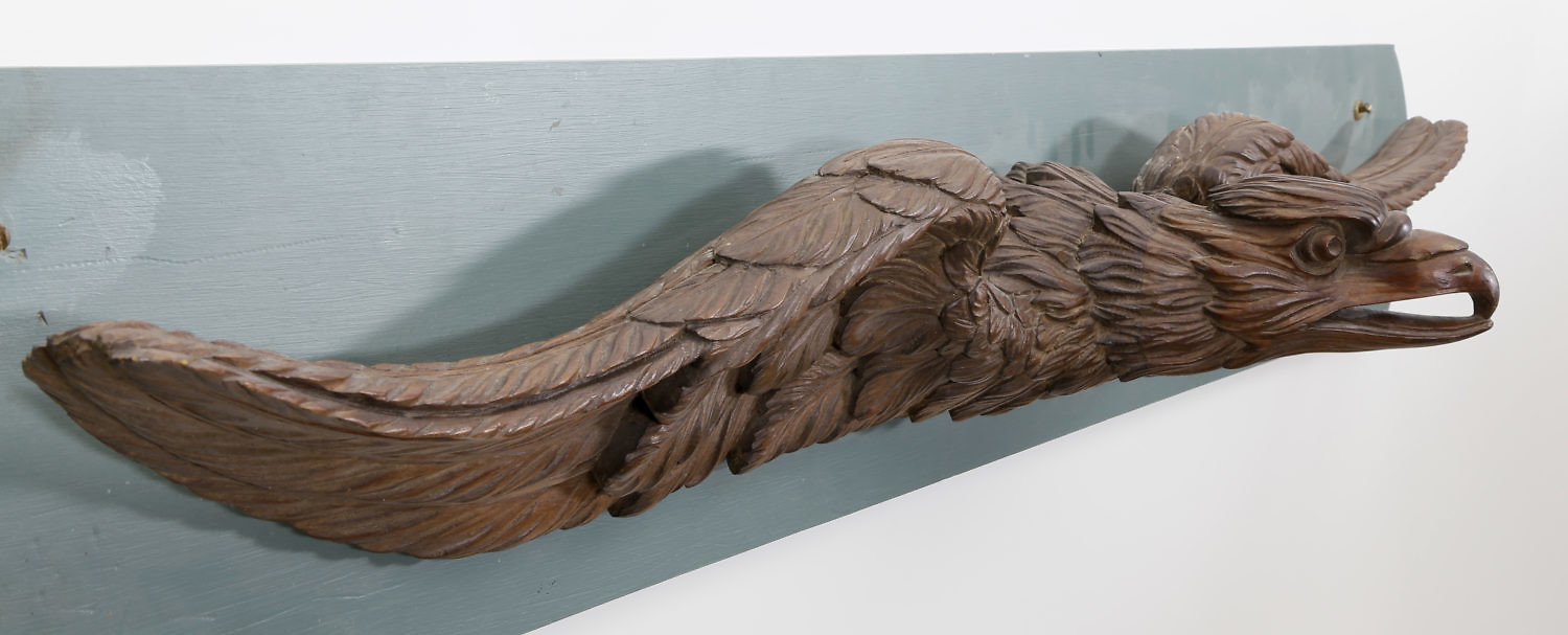 American Carved Pine Bald Eagle Stern Type Plaque Consign Now DeptAmericana and Folk Arts, Furniture/Decorative ArtsSizeLength 49 ½ in. Height 10 in. American Carved Pine Bald Eagle Stern Type Plaque, mid 19th century, a graceful front view of an eagle in flight with cocked head, mounted on a contemporary plaque, carved in the school of John Halex Bellamy. Length 49 ½ in. Height 10 in. Please note that this auction has ended. Click here for an overview of this auction.