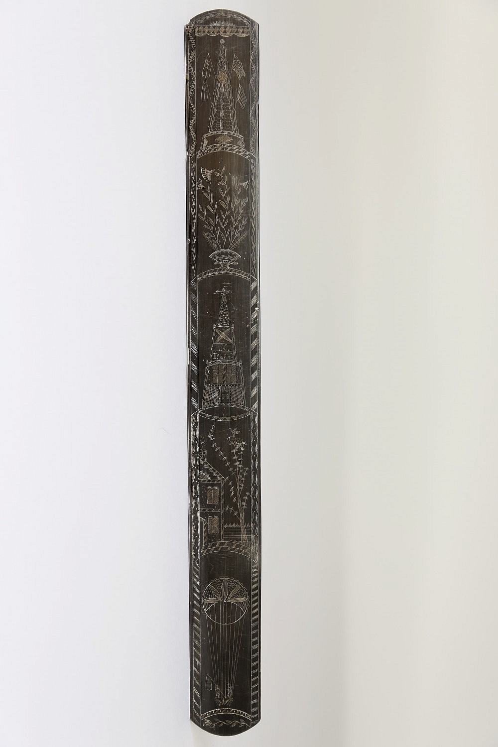American Whaleman Carved and Scrimshawed Baleen Busk, circa 1840, five panels with varying boarders, the upper panel with a monument with American and Allied flags above a floral basket, above a lighthouse (K. Island) a portion of a homestead and two figures with American flag in a hot air balloon.