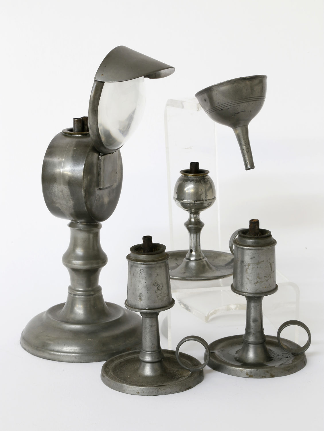 Collection of Five American Pewter Lighting Devices Consign Now Dept19th Century ScrimshawSizeHeights range 3 ¼ in. to 9 ¼ in. Collection of Five American Pewter Lighting Devices, 19th century, comprised of a pair of diminutive whale oil courting lamps, whale oil reflector lamp, single whale oil courting lamp and pewter oil funnel. Heights range 3 ¼ in. to 9 ¼ in. Please note that this auction has ended. Click here for an overview of this auction.