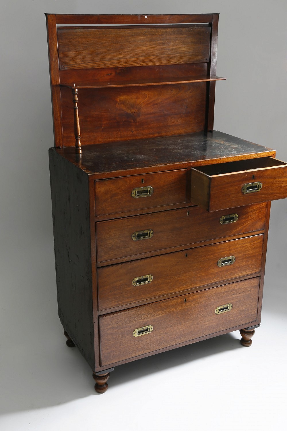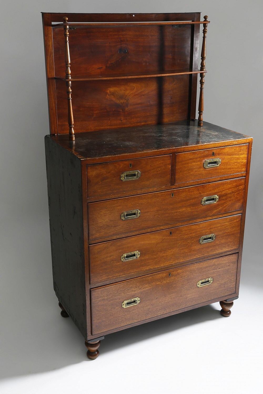 English Mahogany Brass Bound Campaign Chest of Drawers, circa 1850 with removable feet and columns for the tuck-away two-tier shelf.