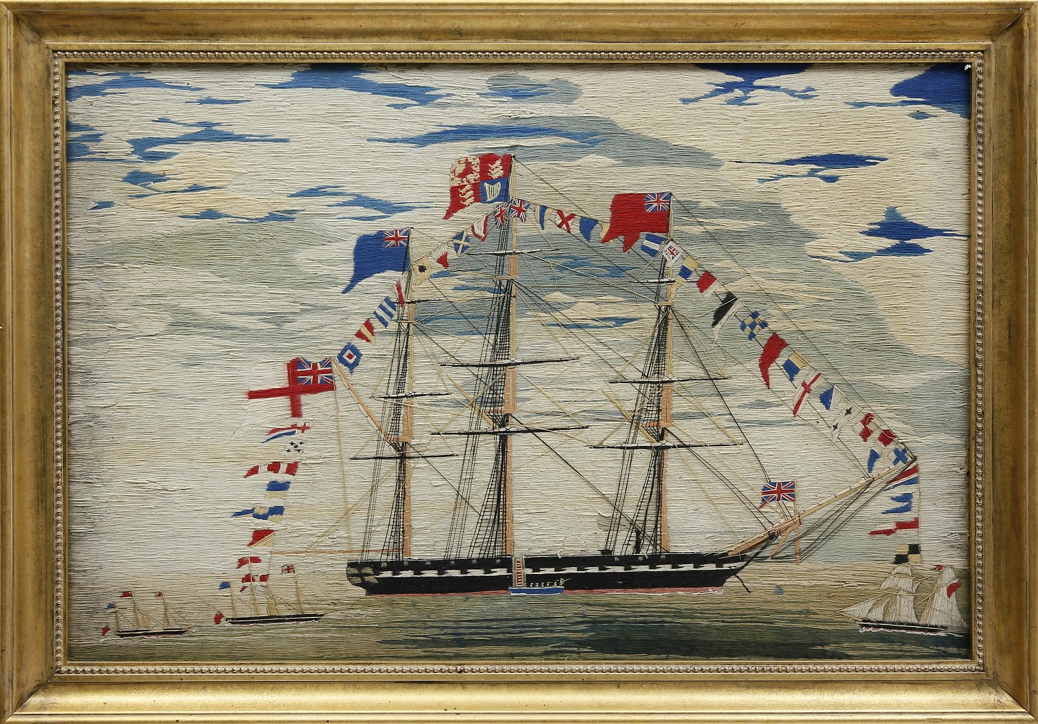 Fine British Sailor Woolwork, circa 1850, portrait of a ship-of-the-line at anchor flying the Royal Standard which is customary when Queen Victoria was aboard – celebrating the event by dressing up with flags. Longboat alongside, signal flags and flurry of smaller boats in attendance.