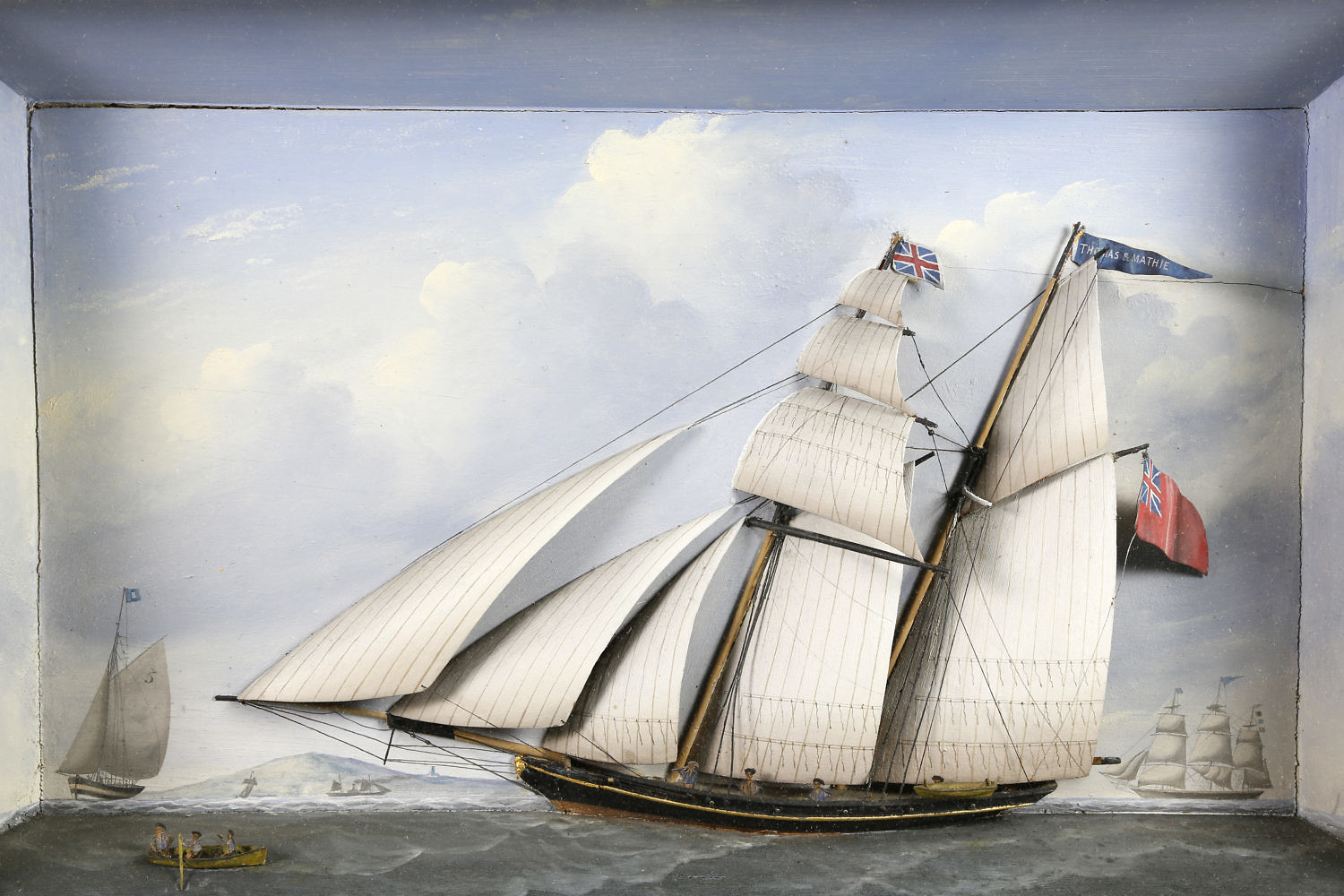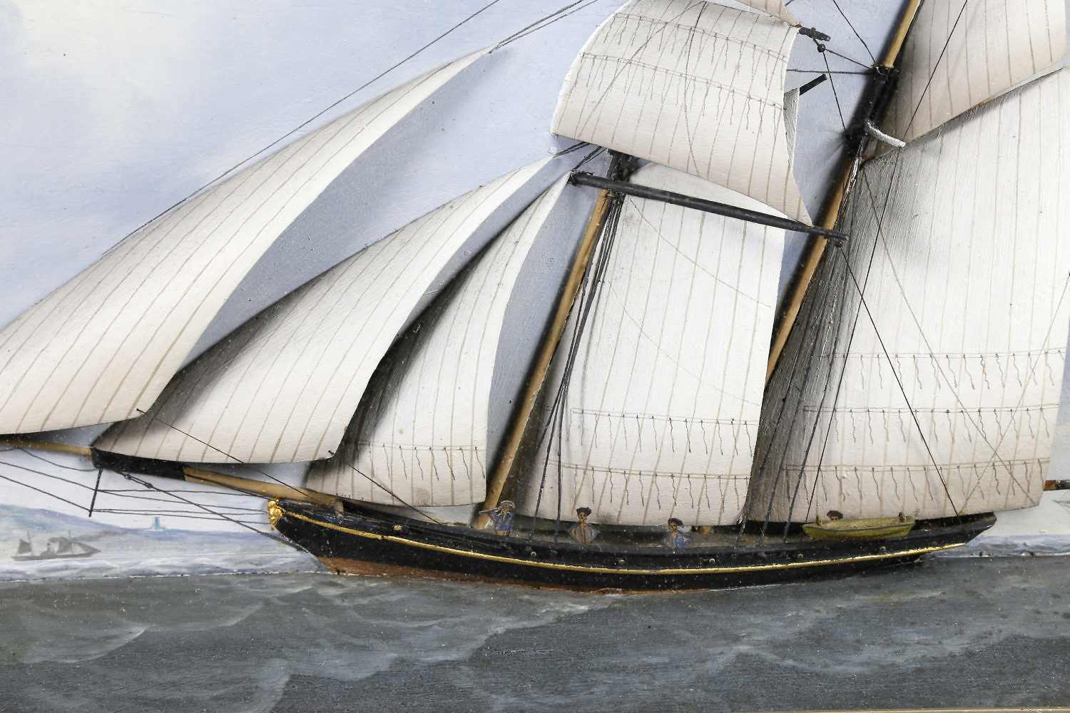Fine Shadowbox Diorama of the English Yacht Thomas & Mathie, with painted sails, four deck hands, one with a telescope, seven ships painted as the background, three sailors in a dory, encased in a broad rosewood and gilt lined frame.