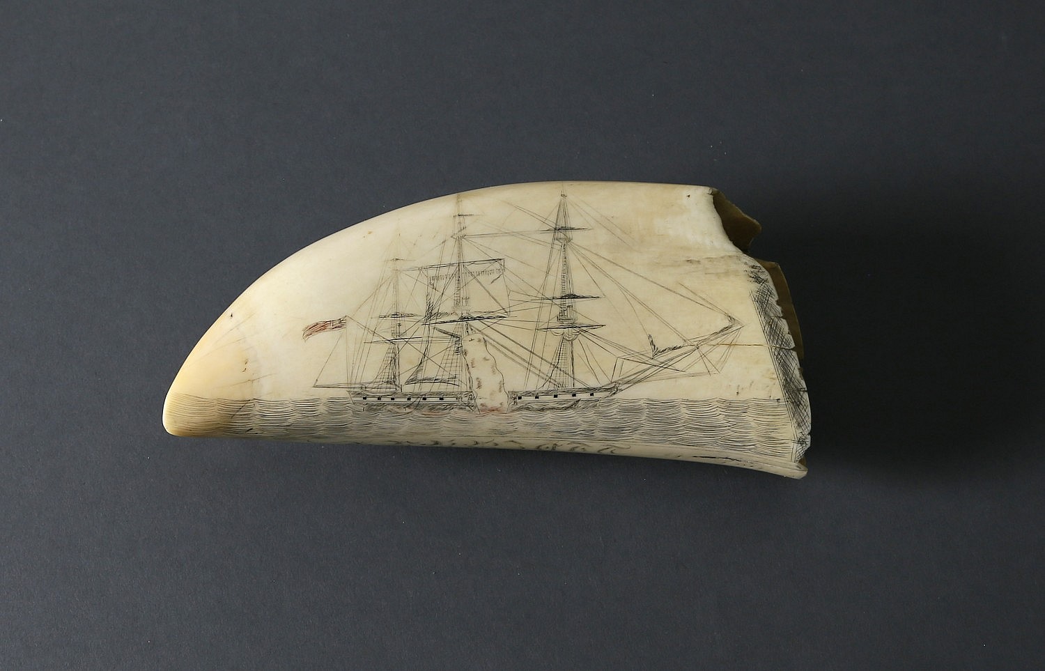 Fine Whaleman Scrimshaw Sperm Whale Tooth, circa 1850, a starboard profile view of an English Royal whaling bark possibly the ship Harriott encompassing most of the tooth with 3 crew cutting-in with some polychrome, and a polychrome British flag, as well as the Royal pennant on the main mast with initials “H.R.H.” Very stylized script at the edge which appears to read as Harriott. The reverse with 4 deeply carved whaling bark hulls with furled sails and a fortress and housing atop a hill with a mission style structure below and long commercial style building.