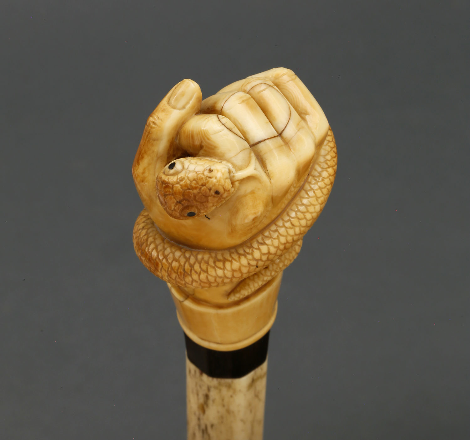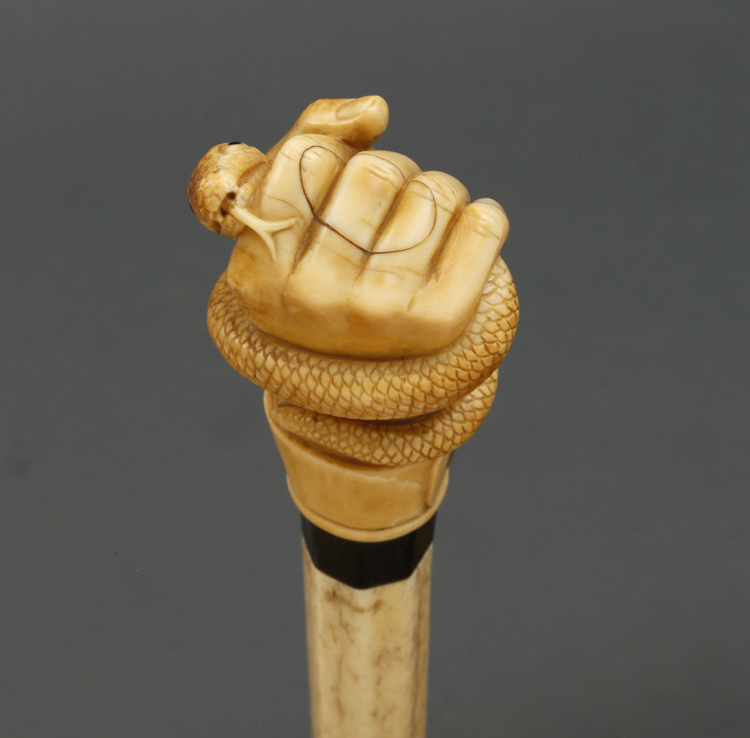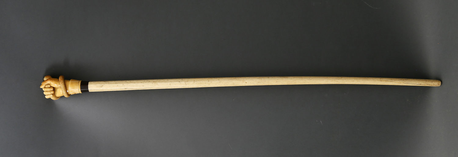 Fine Whaler Carved Whale Ivory and Whalebone Walking Stick, circa 1840, carved right hand with shirt cuff and baleen button clenching a snake by the head with forked tongue striking and body wrapped around the hand, octagonal ebony spacer on a conforming whalebone shaft, transitioning to round.