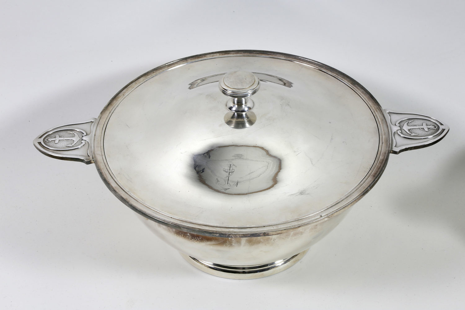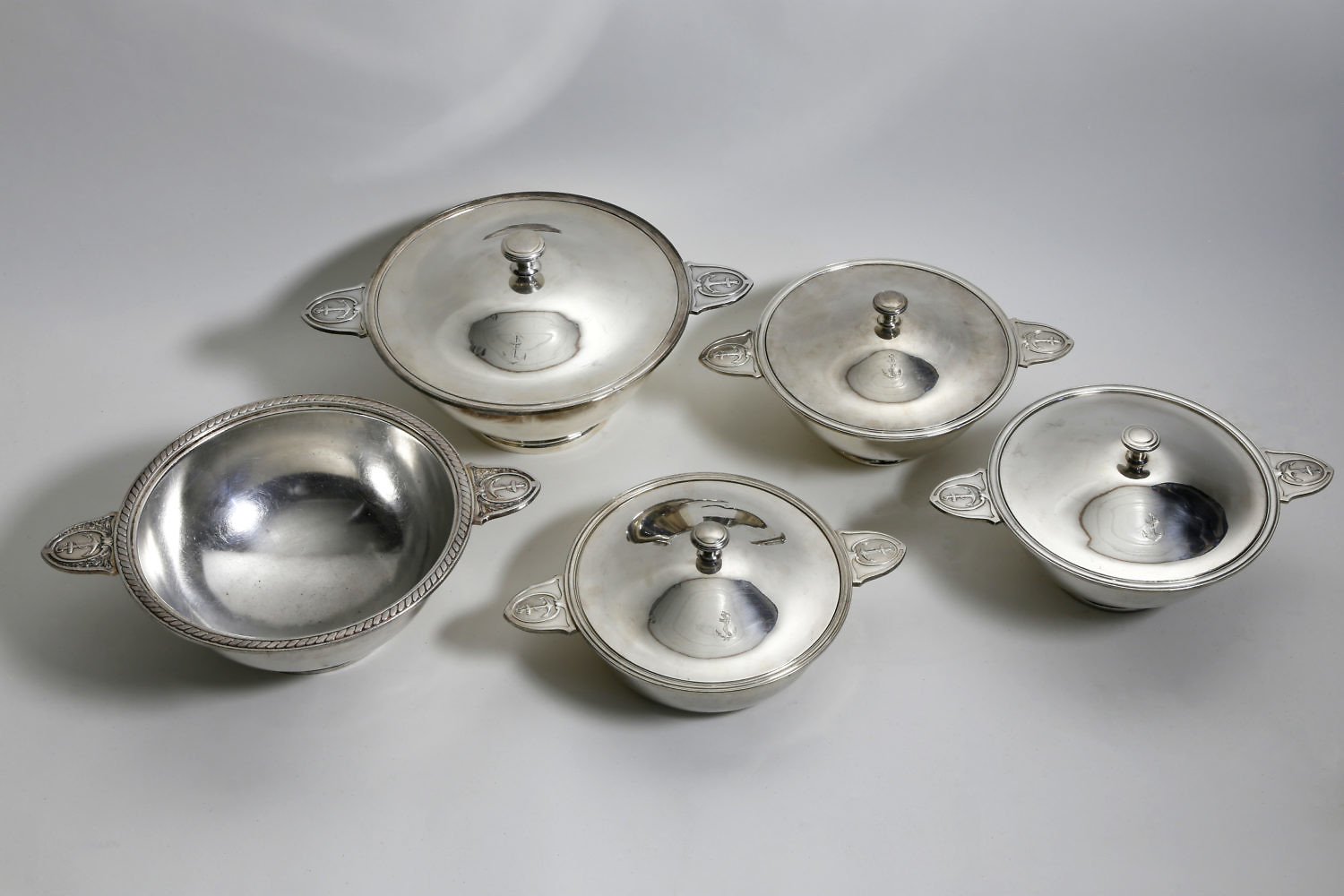 Group Of Five Christofle, Ercuis and Blanc French Silver Plate Covered Nautical Decorated Tureens, mid 20th century, with anchor and rope decorated handles; Manufactured by Christofle, Ercuis and Blanc.
