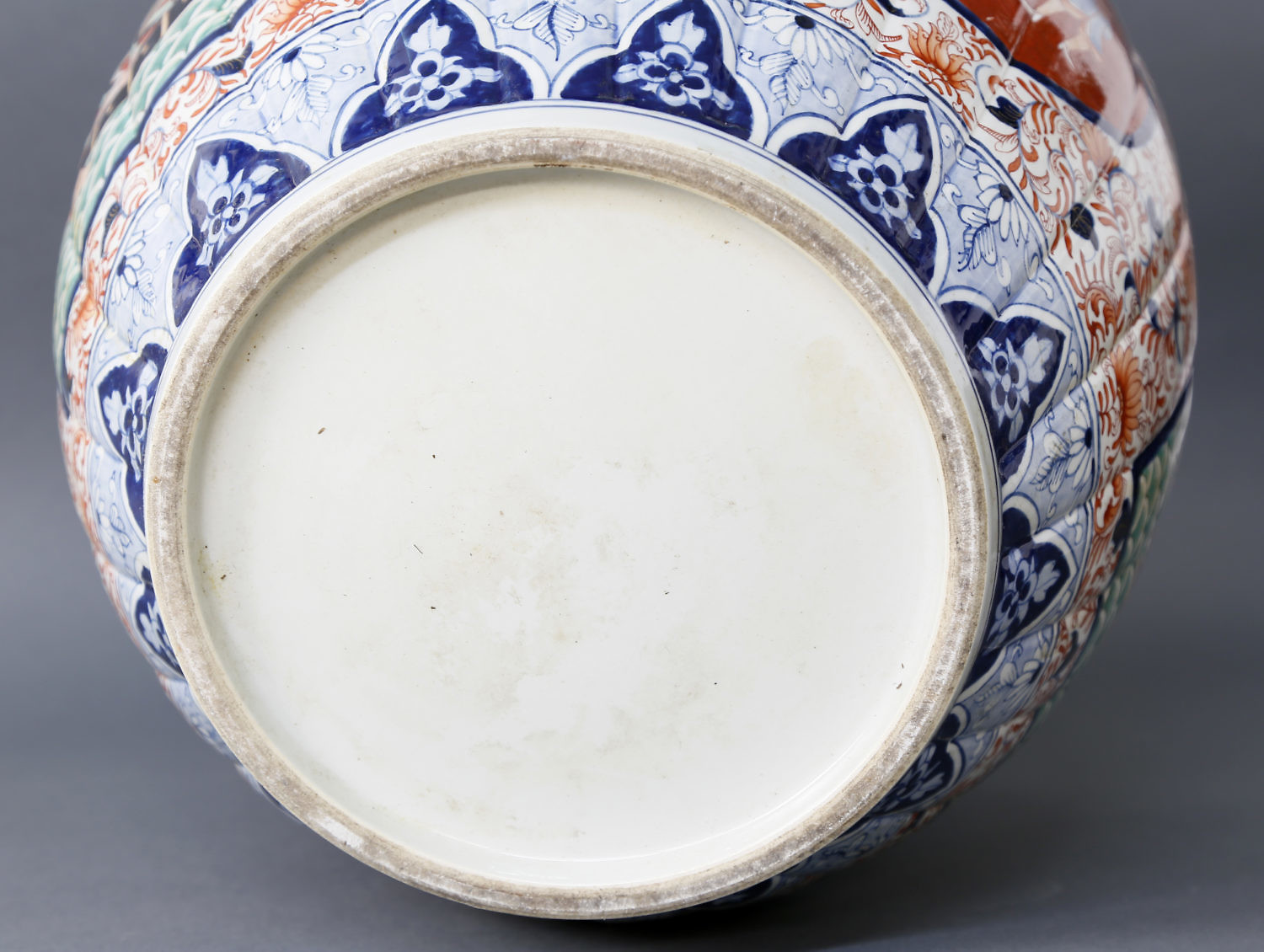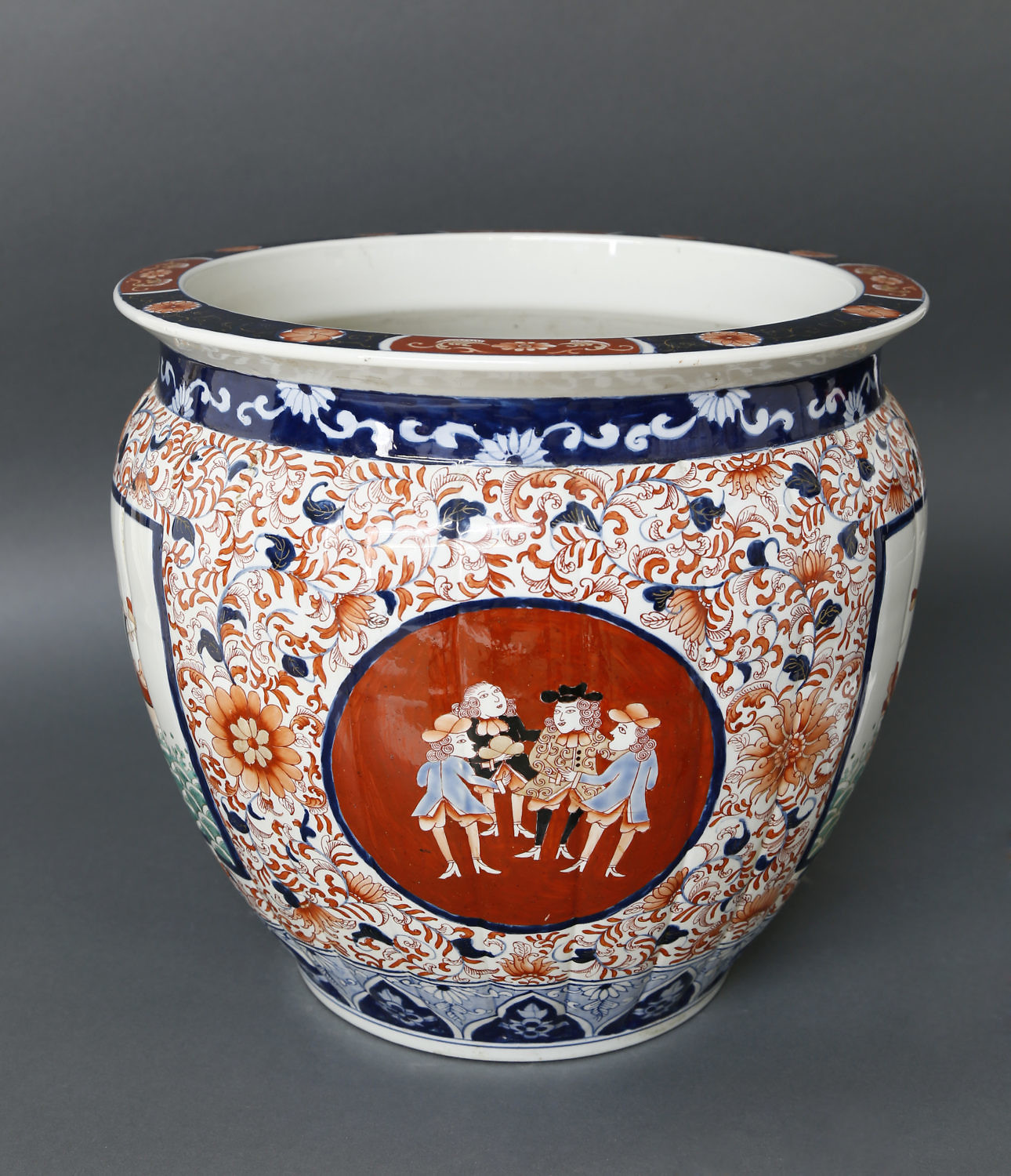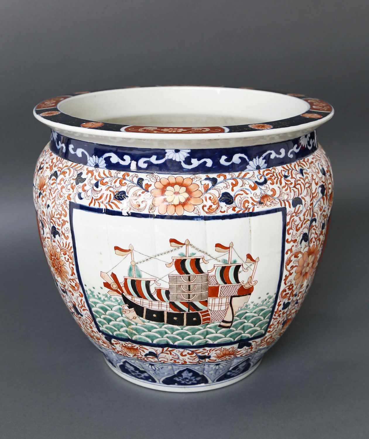 Imari Porcelaneous Stoneware Jardiniere, late 19th century, the everted rim is decorated with a band of floral and foliate motifs and projects above a melon-reeded ovoid body featuring two large oblong reserves of a galleon flanked by smaller rondels of four European men as seen by Japanese eyes against a ground of stylized flowering vines.