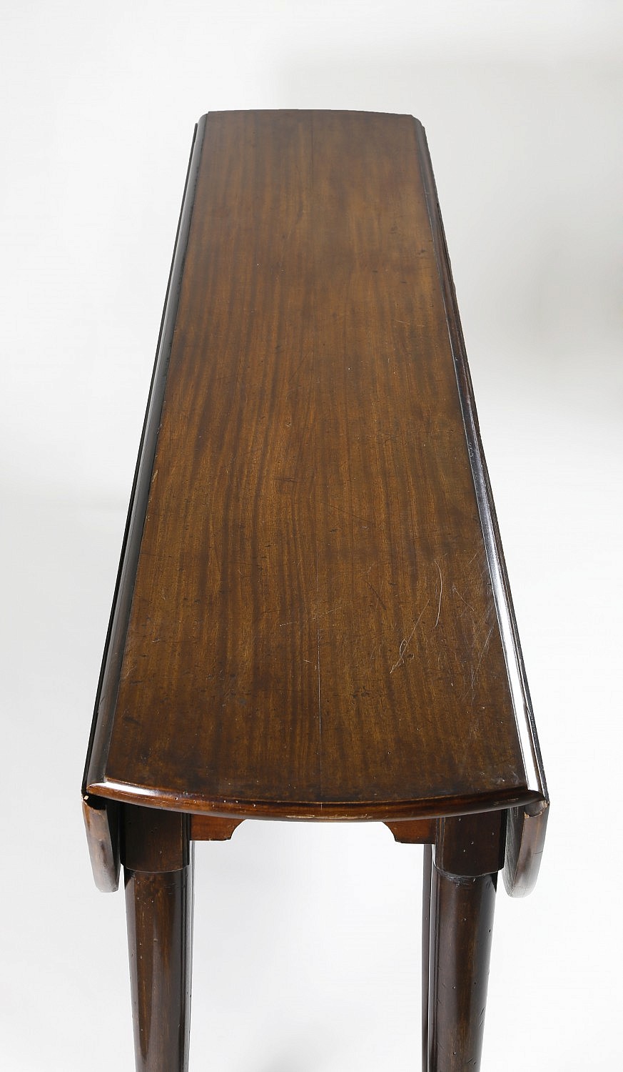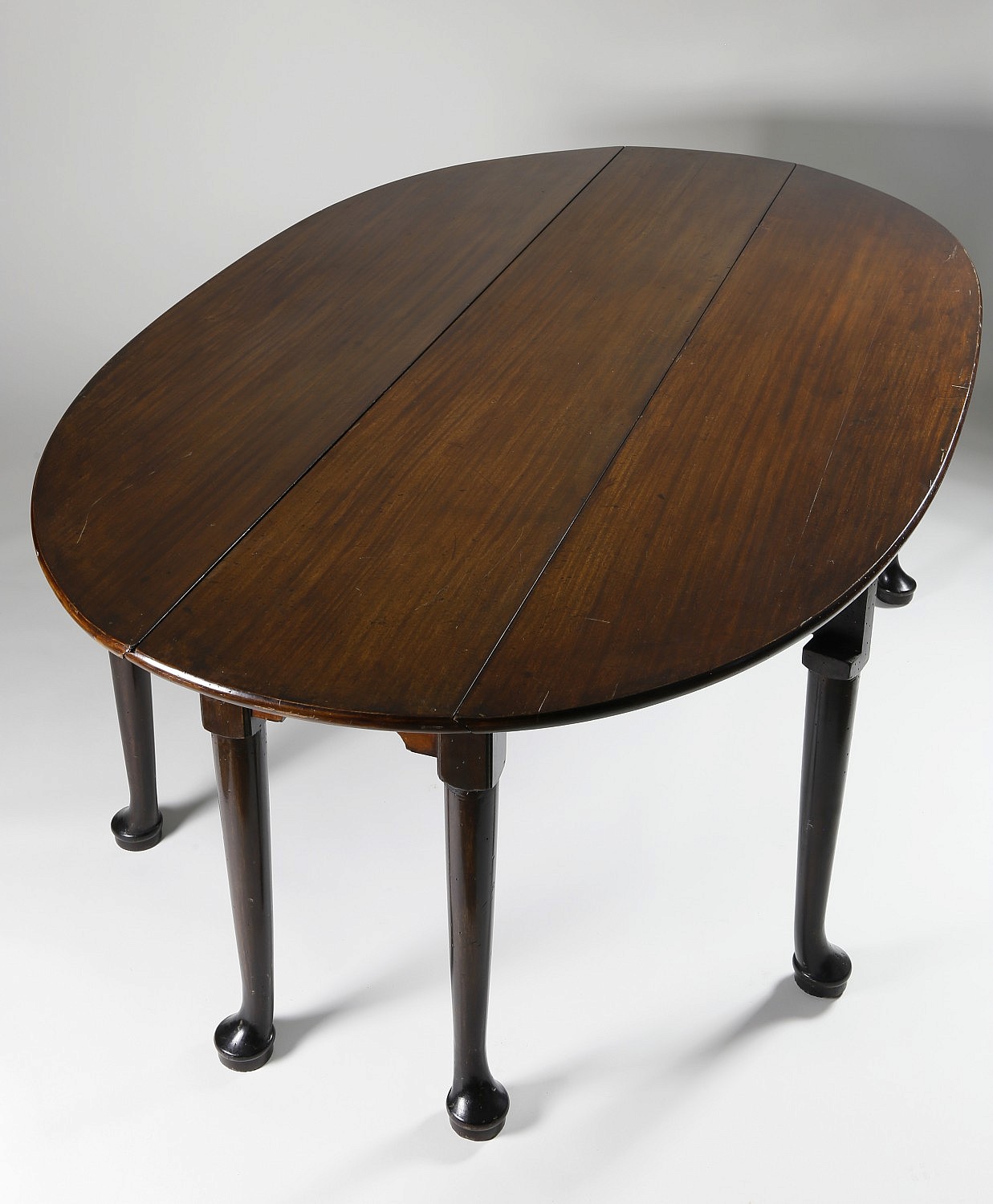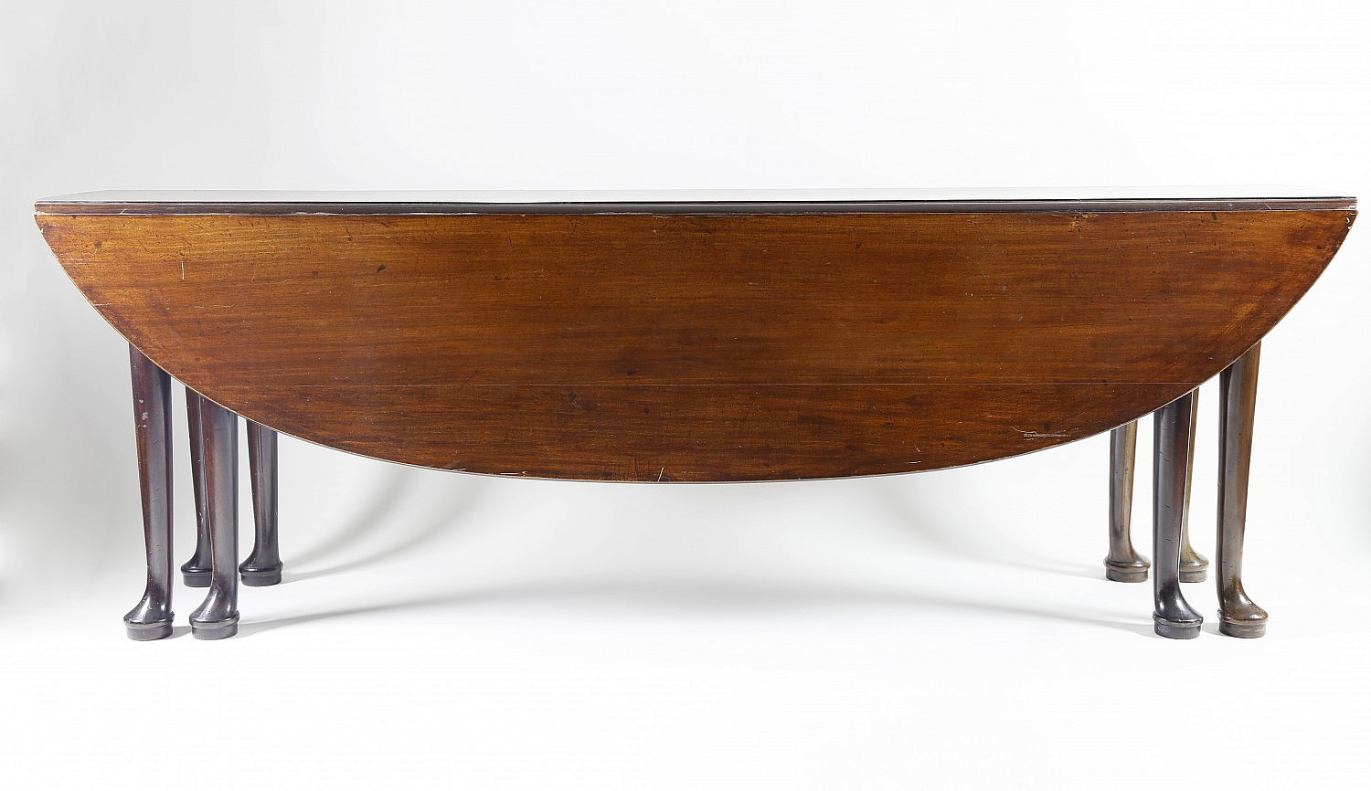 Irish Mahogany Queen Anne Hunt Table, mid 18th century, three-board top supported on eight straight legs on cushioned pad feet, four gate legs support two d-shaped drop leaves.