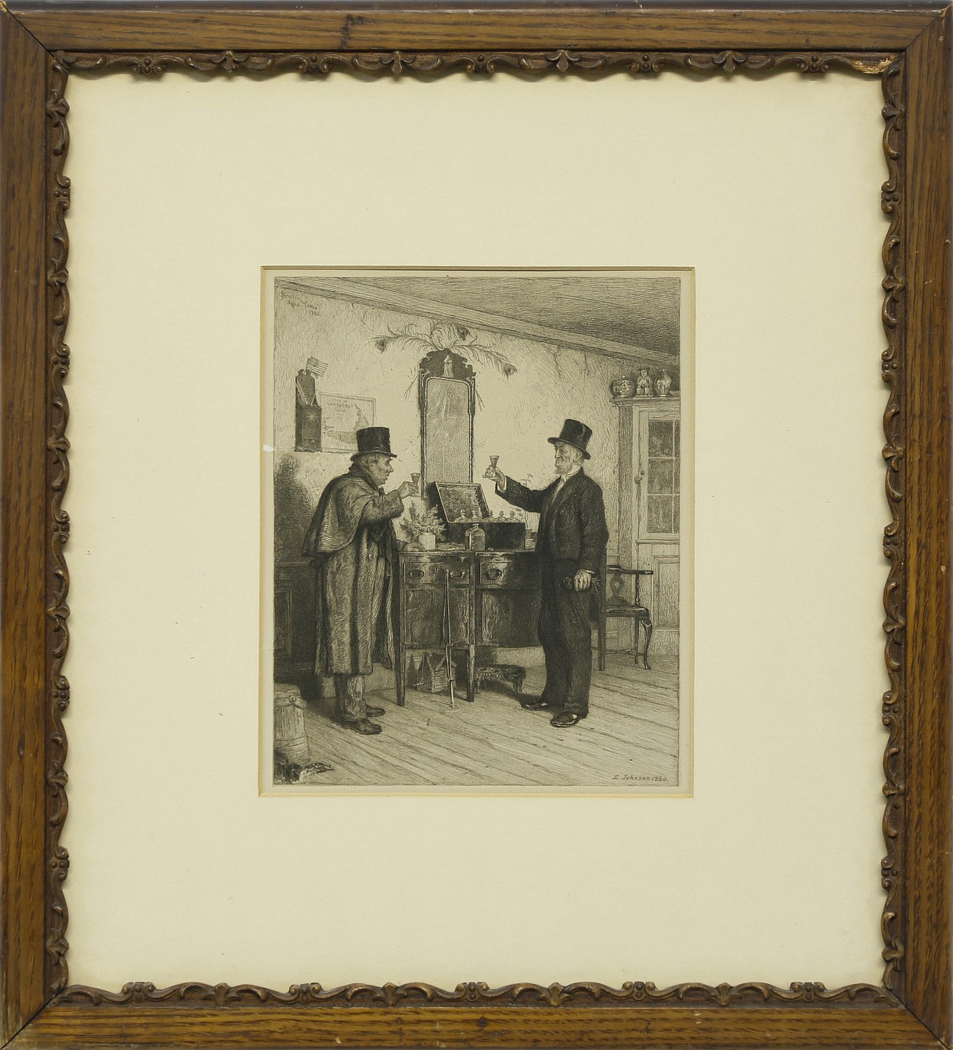 James D. Smillie (American 1833-1909) After Eastman Johnson (American 1824-1906) Etching “A Glass with the Squire”, signed within the plate top left, “Smillie Agua Fortis 1886”, signed within the plate lower right, “Eastman Johnson 1880” in an oak frame with pressed scrolls.