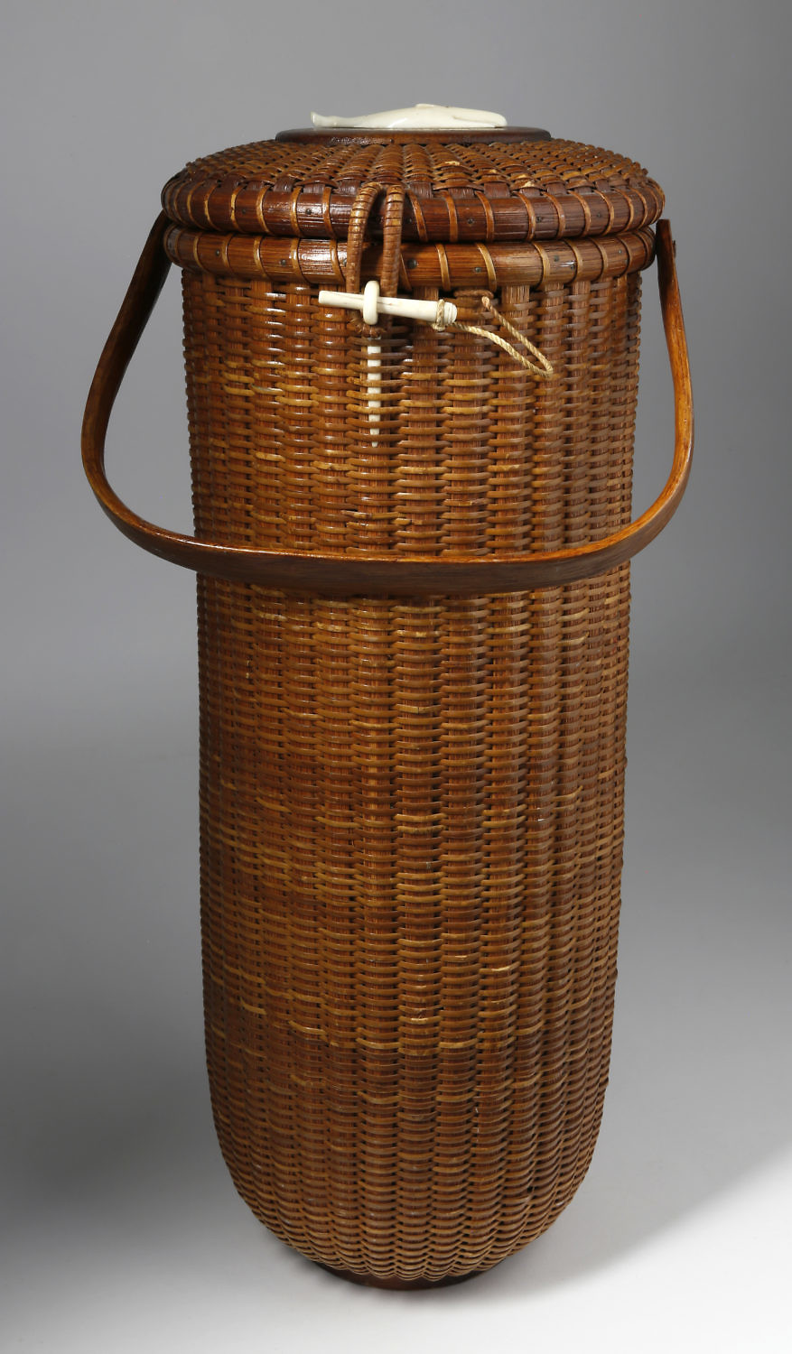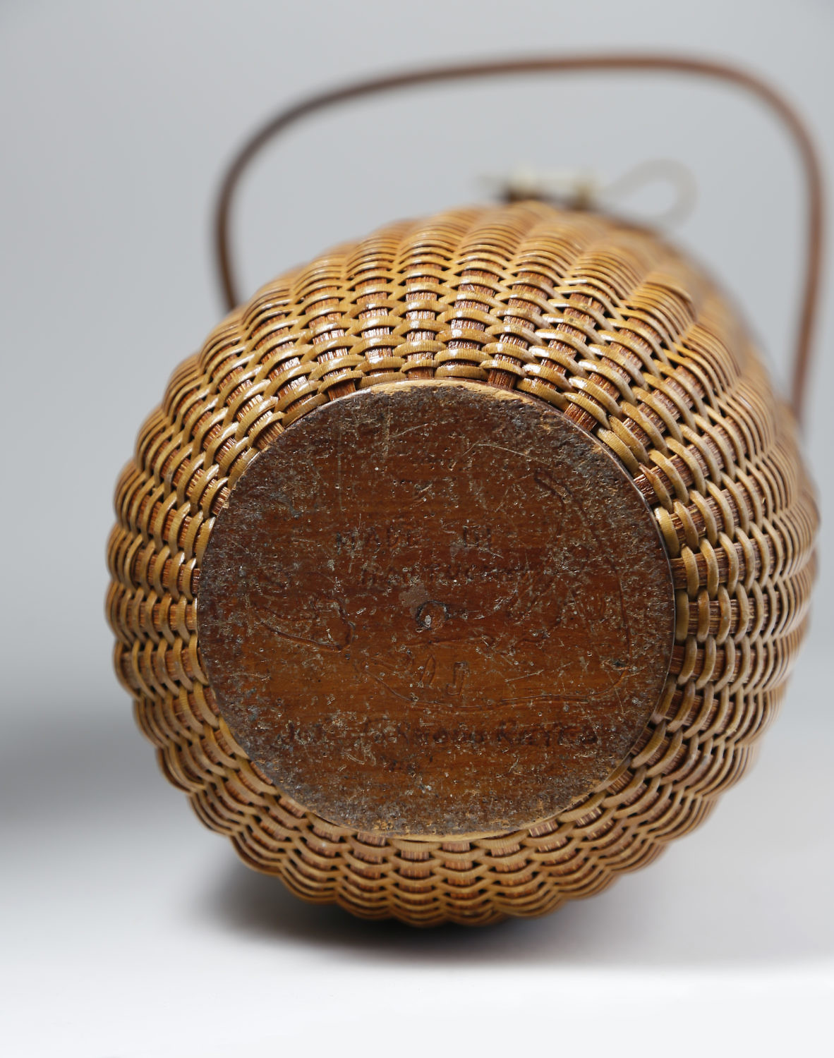 José Formoso Reyes (1902-1980) Knitting Basket, circa 1955, the leather loop hinges to a round cover mounted with a whale ivory carved sperm whale by Charlie Sayle, on a tall round basket with a swing handle, whale ivory clasp and peg, signed upon the base “Made in Nantucket, José Formoso Reyes” and outlined map of Nantucket Island.