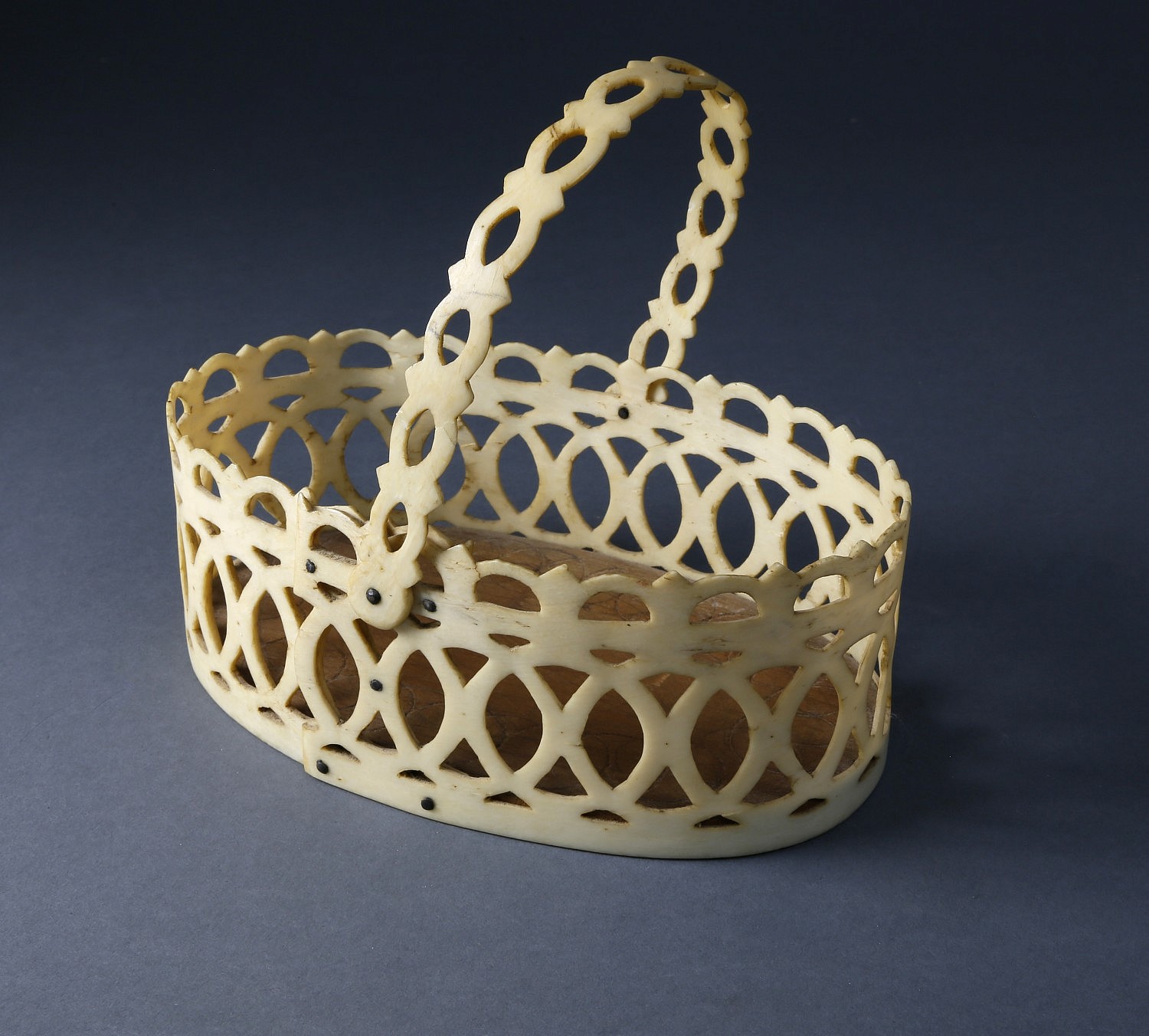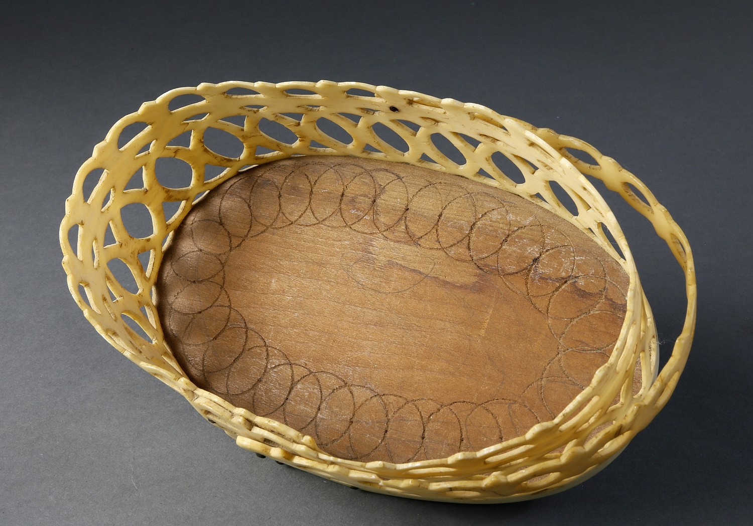 Nantucket Whaler Made Pierced Panbone Oval Swing Handle Basket, circa 1840, oval form with interlocking circles and arches and spikes surround a cherry wood bottom having interior interlocking scribed circles. The swing handle riveted to the basket.