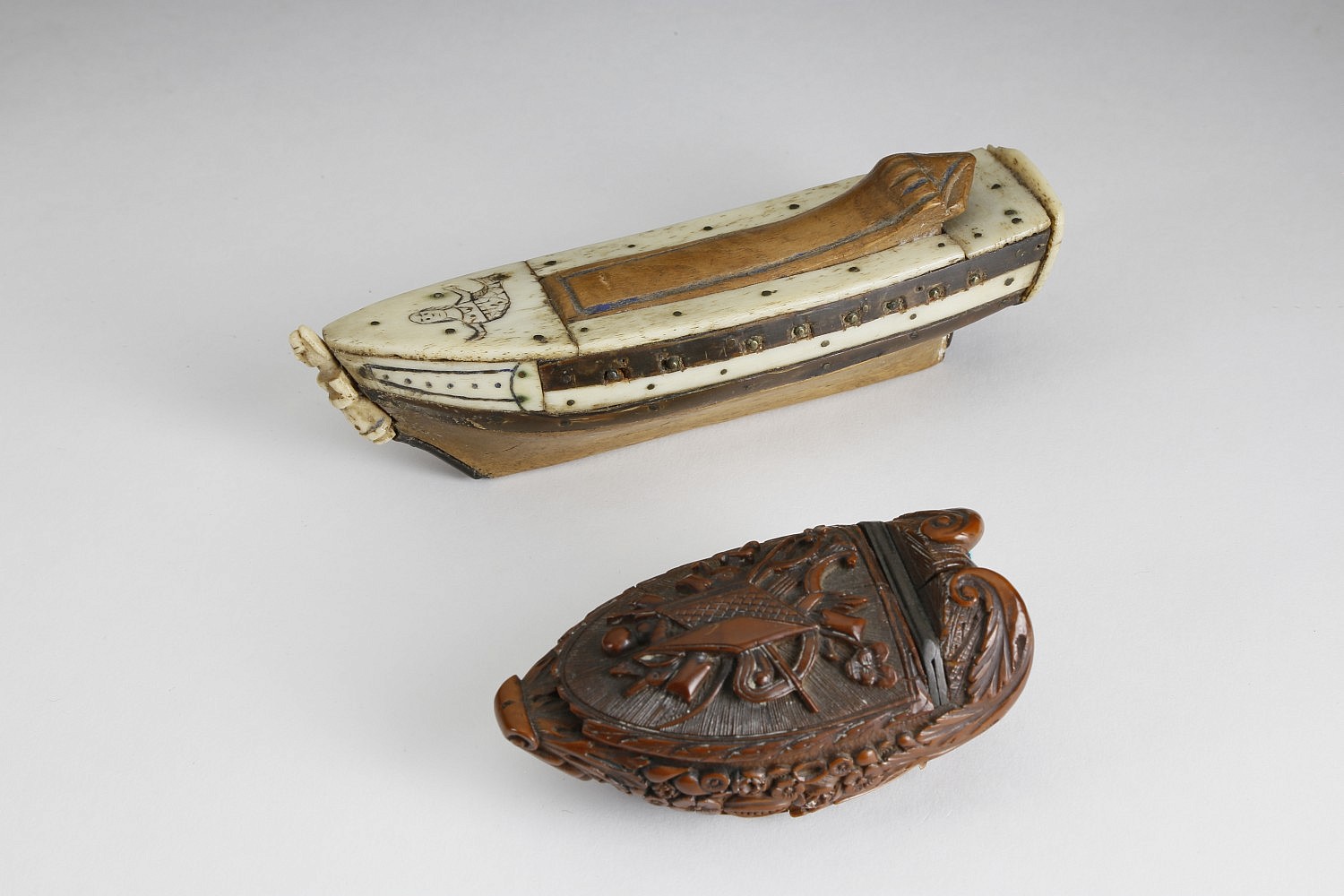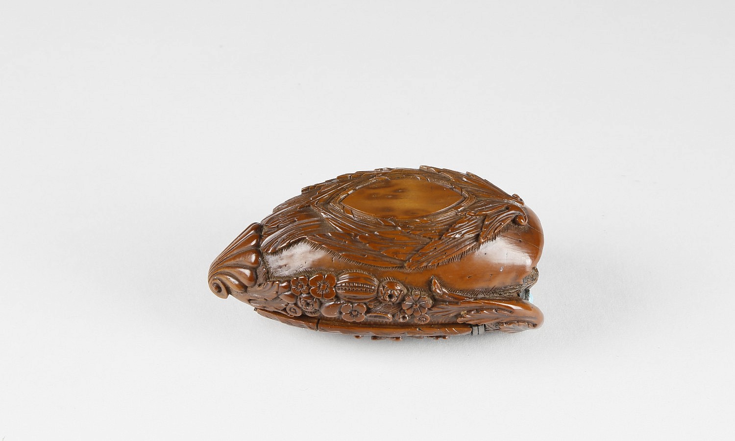 Napoleonic Carved Seed Pod Snuff Box, circa 1810, fashioned stylized boat with scalloped shell bow and beetle head with inlaid turquoise eyes, beetle head stern, the hinged lid carved profusely with tools and instruments.