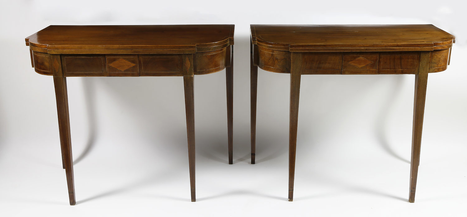 Pair of American Hepplewhite Mahogany Diamond and Line Inlaid Game Tables, circa 1790-1805, rectangle top with cut corners inlaid at the edge and triple contrasting line, hinged to a conforming base with line and diamond inlaid frieze on square tapering legs.