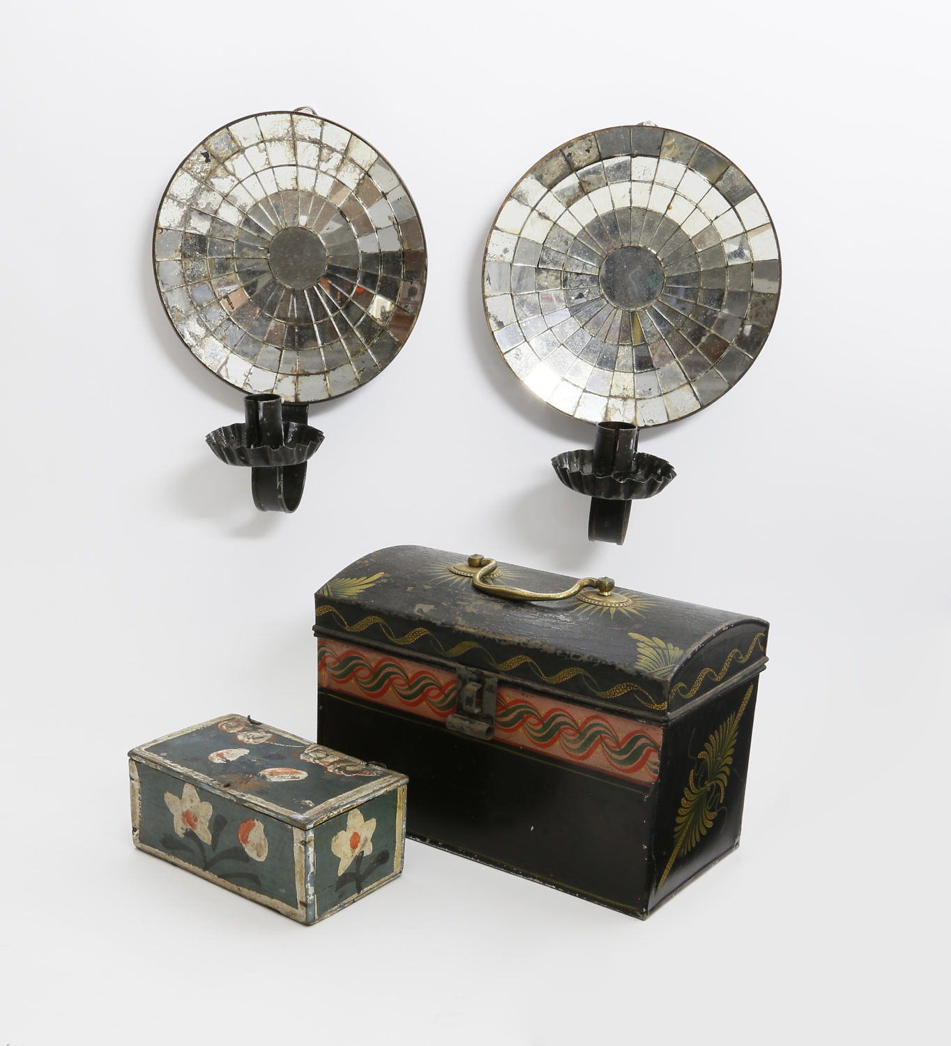 Lot 314: Pair of American Tin Reflective Candle Sconces, circa 1820, each with multi-piece mirrored glass reflector cones, tin candle holders, arms, fluted bobeches.