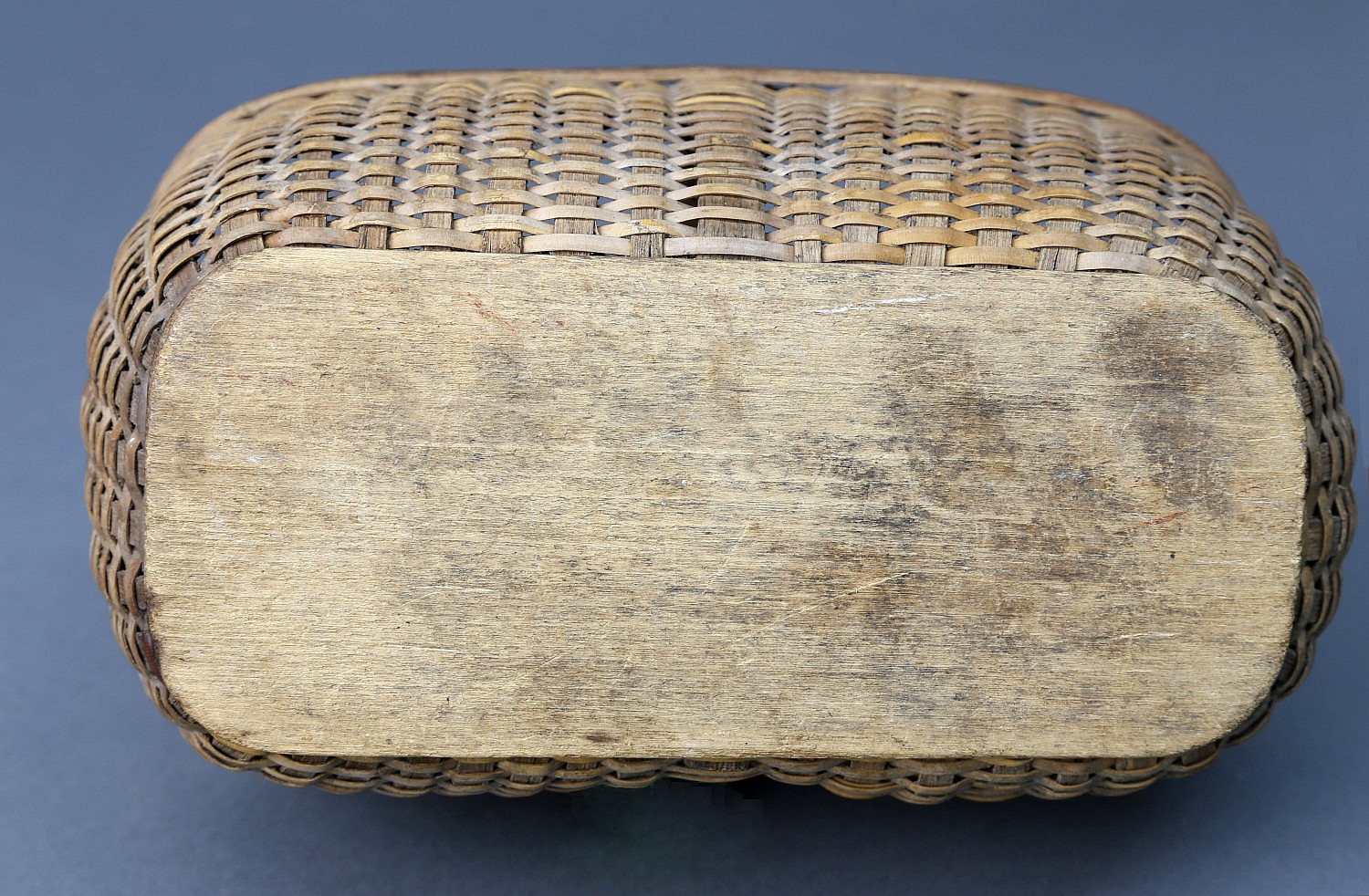Rare Nantucket Chestnut Harvesting Basket, circa 1850, rectangular pine bottom with hickory staves up to an interior and exterior rim, all nailed to the base and rim, with a single continuous stationary handle.