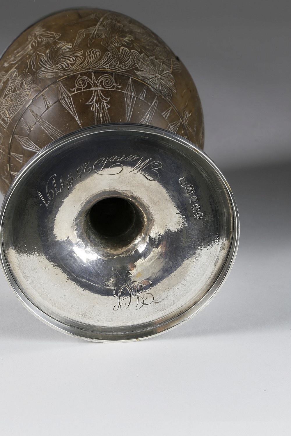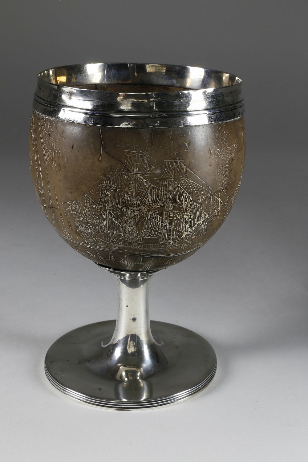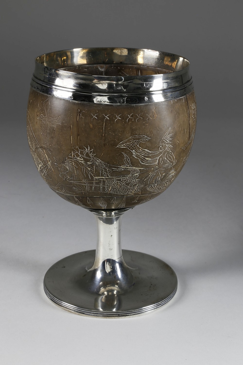 Silver and Scrimshaw Coconut Goblet, circa 1792-93, the bowl engraved with Neptune and his chariot, a British Man-O-War, and a figure of Hope with anchor. The silver pedestal and rim by Phipps & Robinson, presented March 25th, 1797