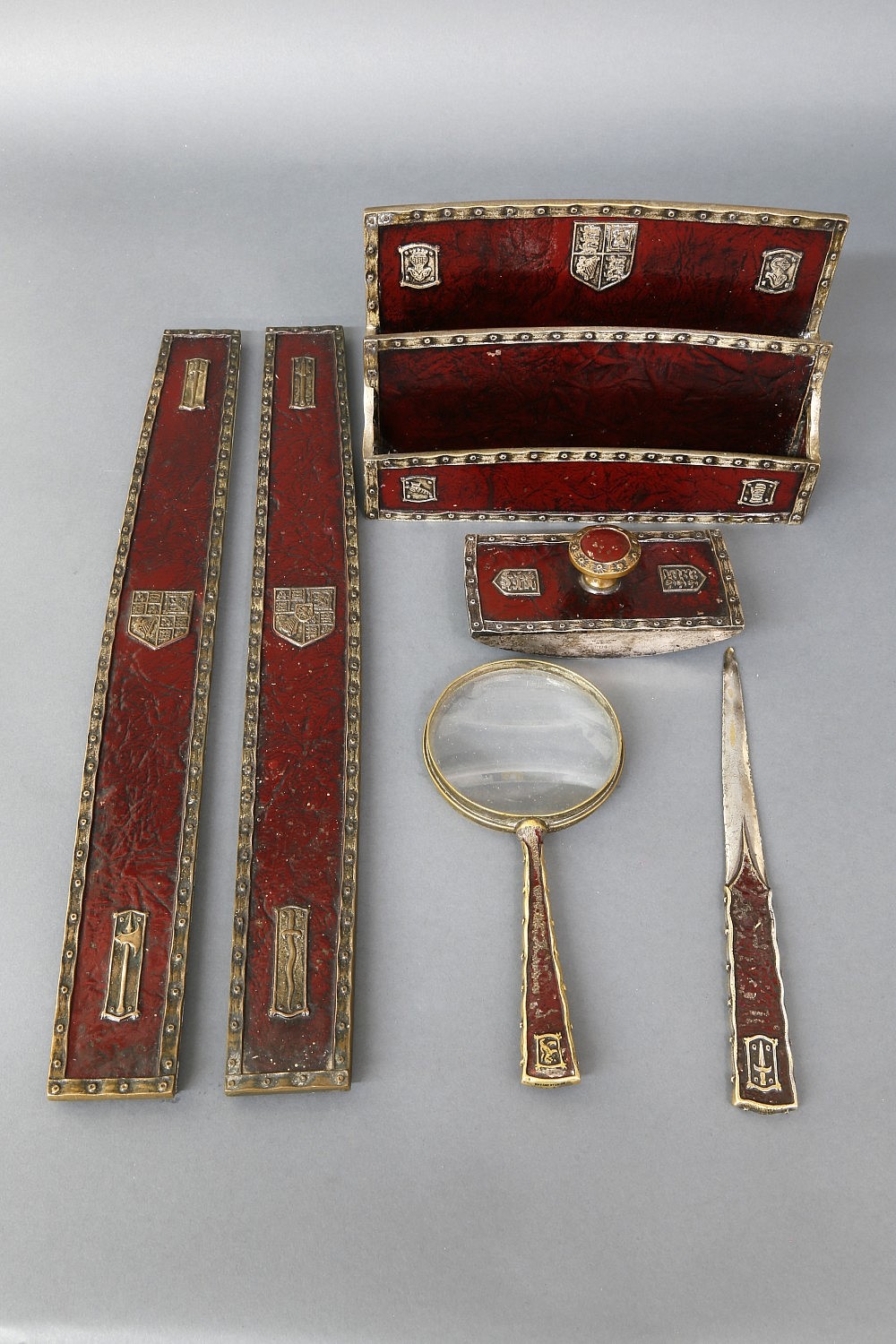 Tiffany Studios Heraldic Pattern Silvered And Red Patinated Bronze Six-Piece Desk Set, comprising letter rack (#2044), paper knife, pair of blotter ends (#2039), magnifying glass, and rocker blotter (#2043); the majority marked Tiffany Studios New York and numbered.