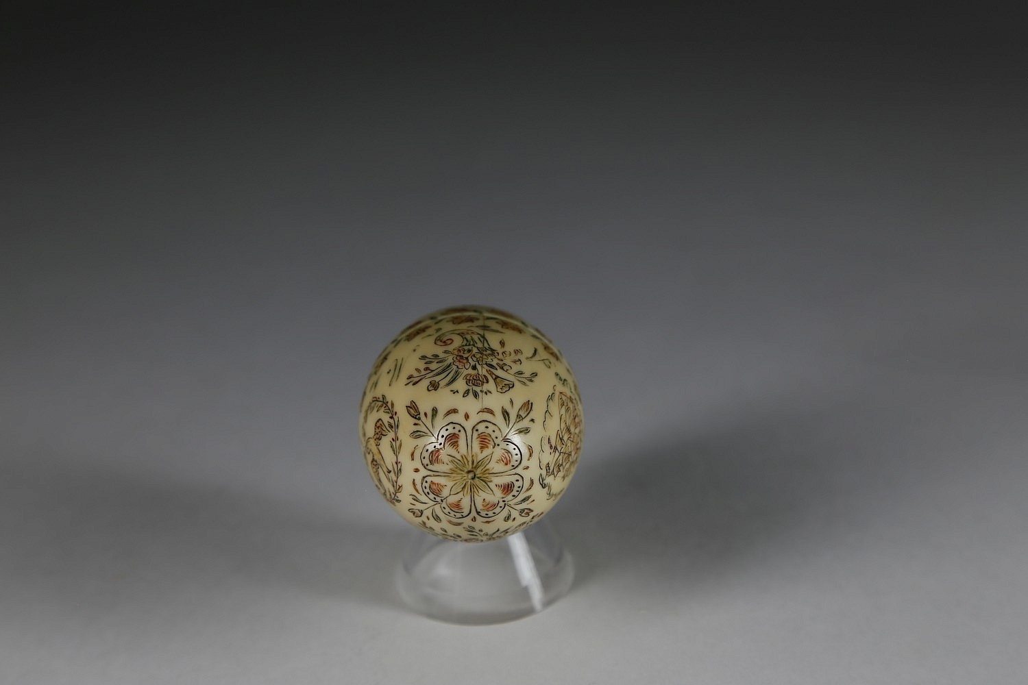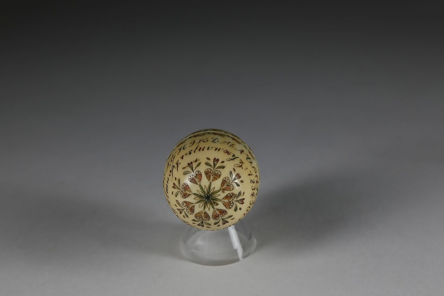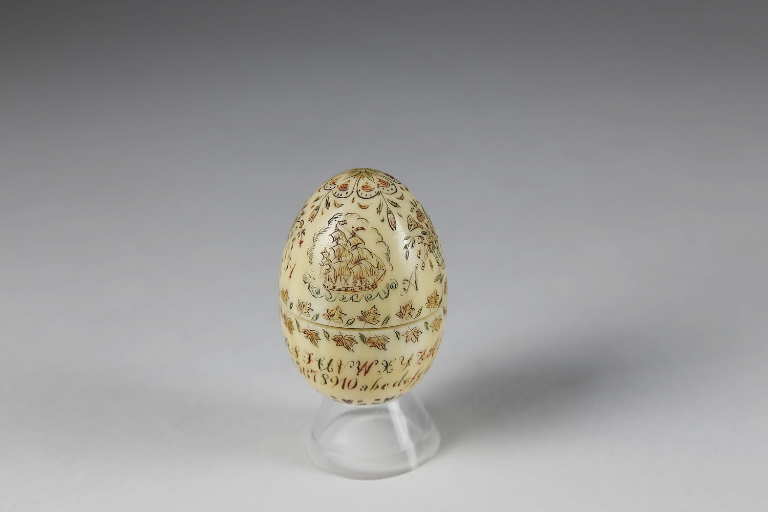 Whaleman Carved and Polychrome Scrimshaw Whale Ivory Thimble Holder, circa 1850, egg form box threaded in the center, the upper section with engraved peace dove, cornucopia and basket of flowers initialed and dated, “A.M. 1851”; the lower section engraved with an alphabet sampler above blooming hearts, with silver engraved thimble.